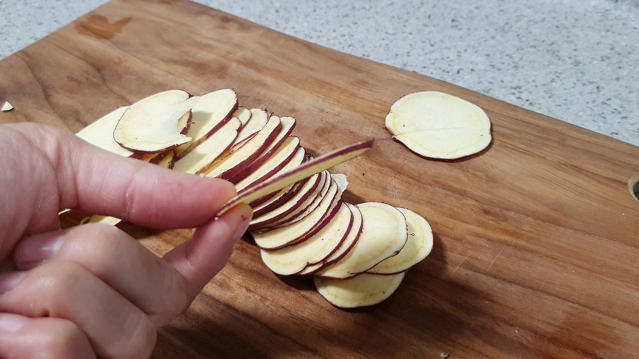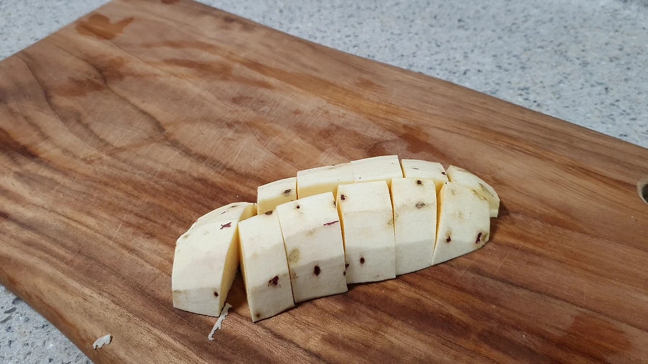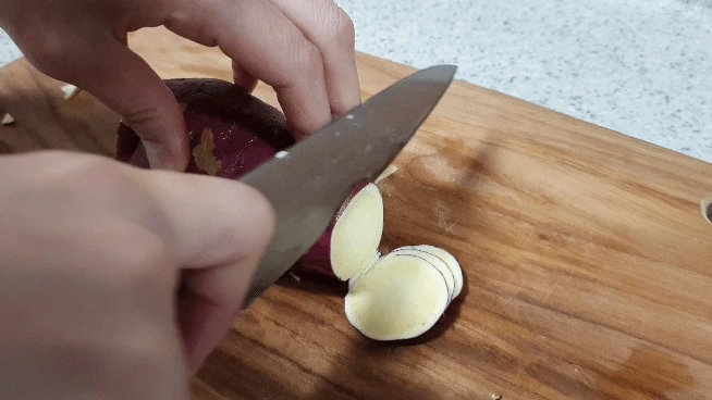 3. 껍질을 벗긴 고구마는 먹기 좋게 썰어주세요