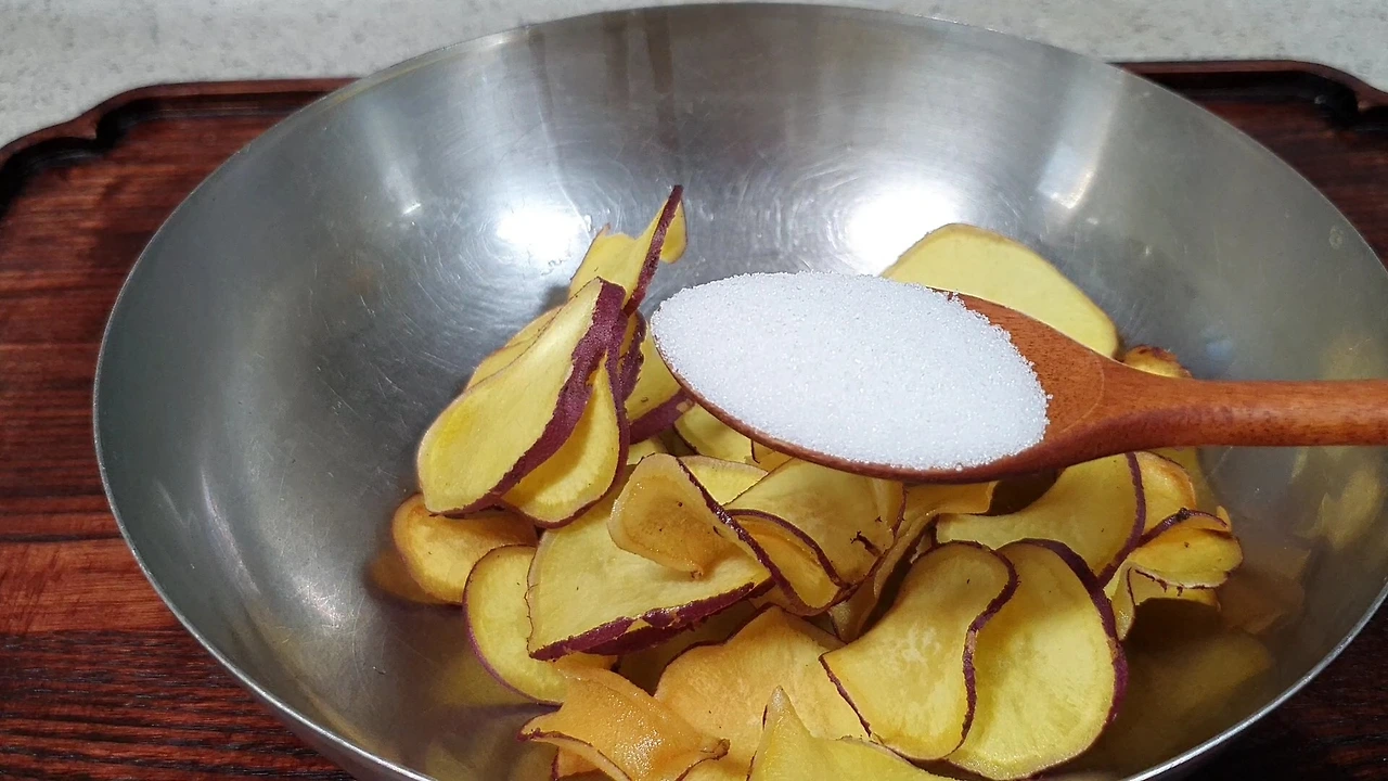 9. 식은 고구마칩에 계피 약간 설탕 1스푼을 넣고 버무려주세요