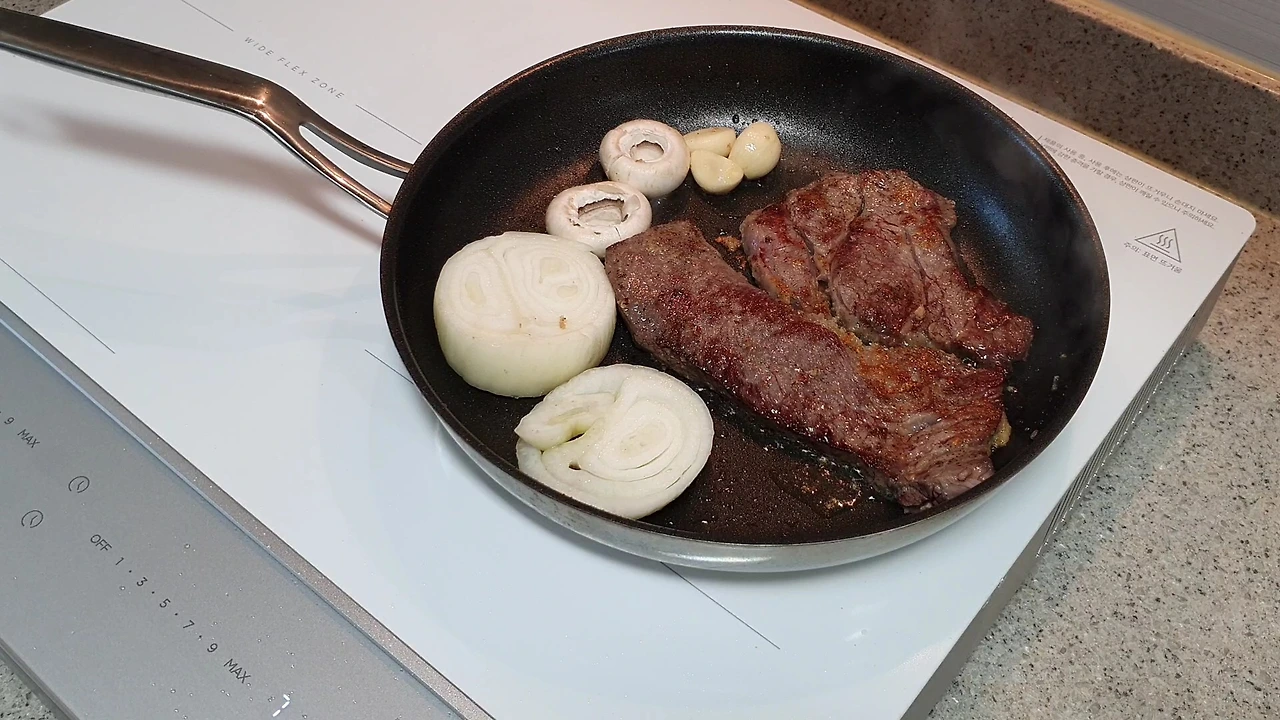 걱정 반 기대 반으로 소고기를 프라이팬에 구워보는데