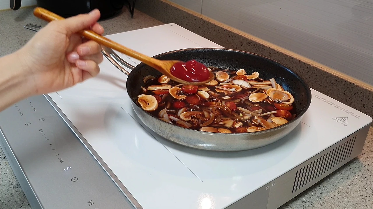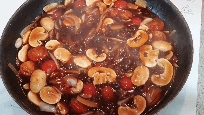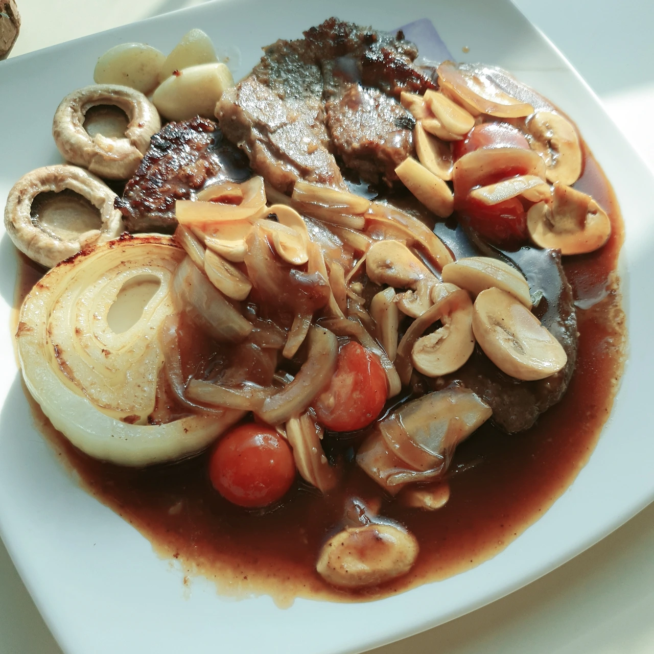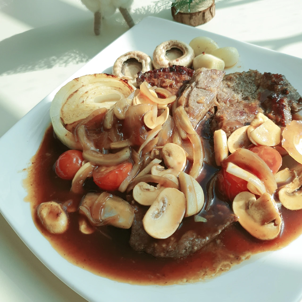 양념재료 : 소금 약간, 후추 솔솔, 마늘 1스푼 올리브유, 스테이크 소스 양파 1개 마늘 토마토 양송이버섯 케첩 2스푼 설탕 조금 버터 2조각