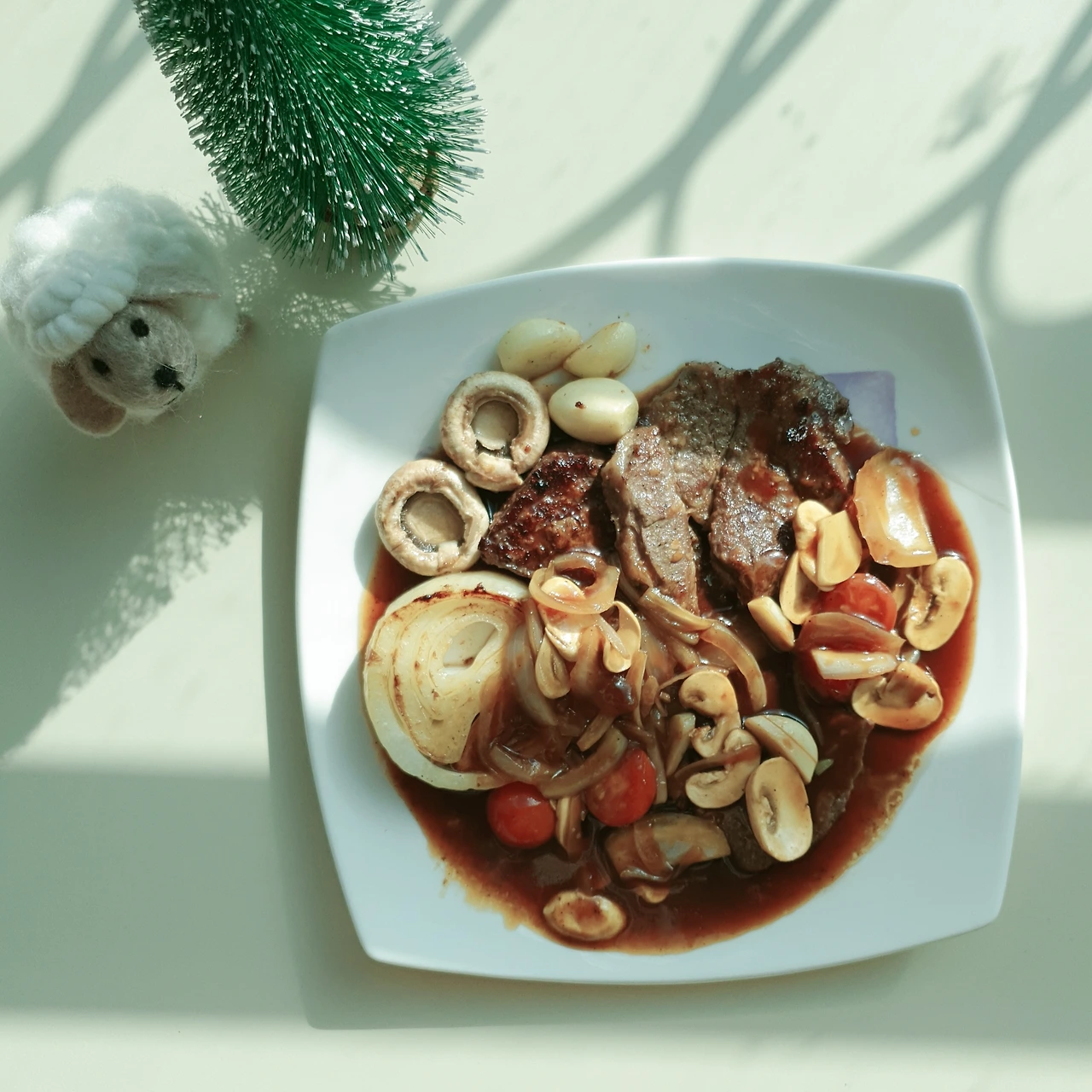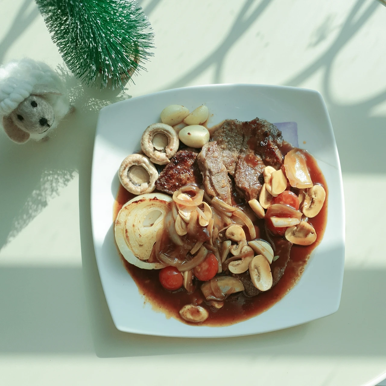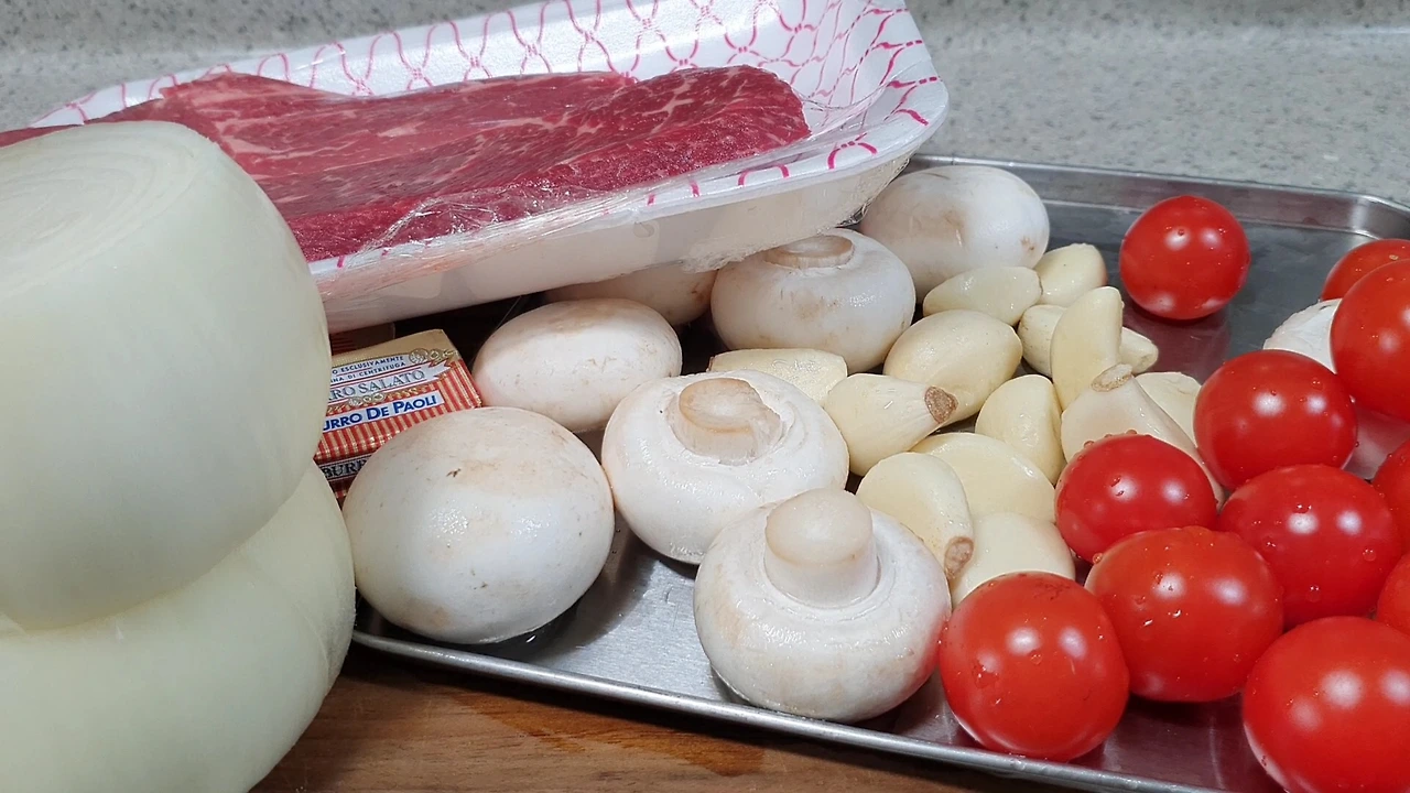 양념재료 : 소금 약간, 후추 솔솔, 마늘 1스푼 올리브유, 스테이크 소스 양파 1개 마늘 토마토 양송이버섯 케첩 2스푼 설탕 조금 버터 2조각