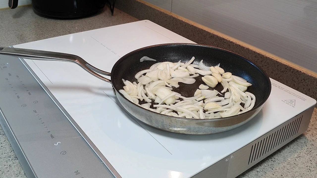 5. 양파와 마늘을 넣고 충분히 볶아주세요 마늘과 양파의 향이 배어 나오게 볶아주시면 됩니다.