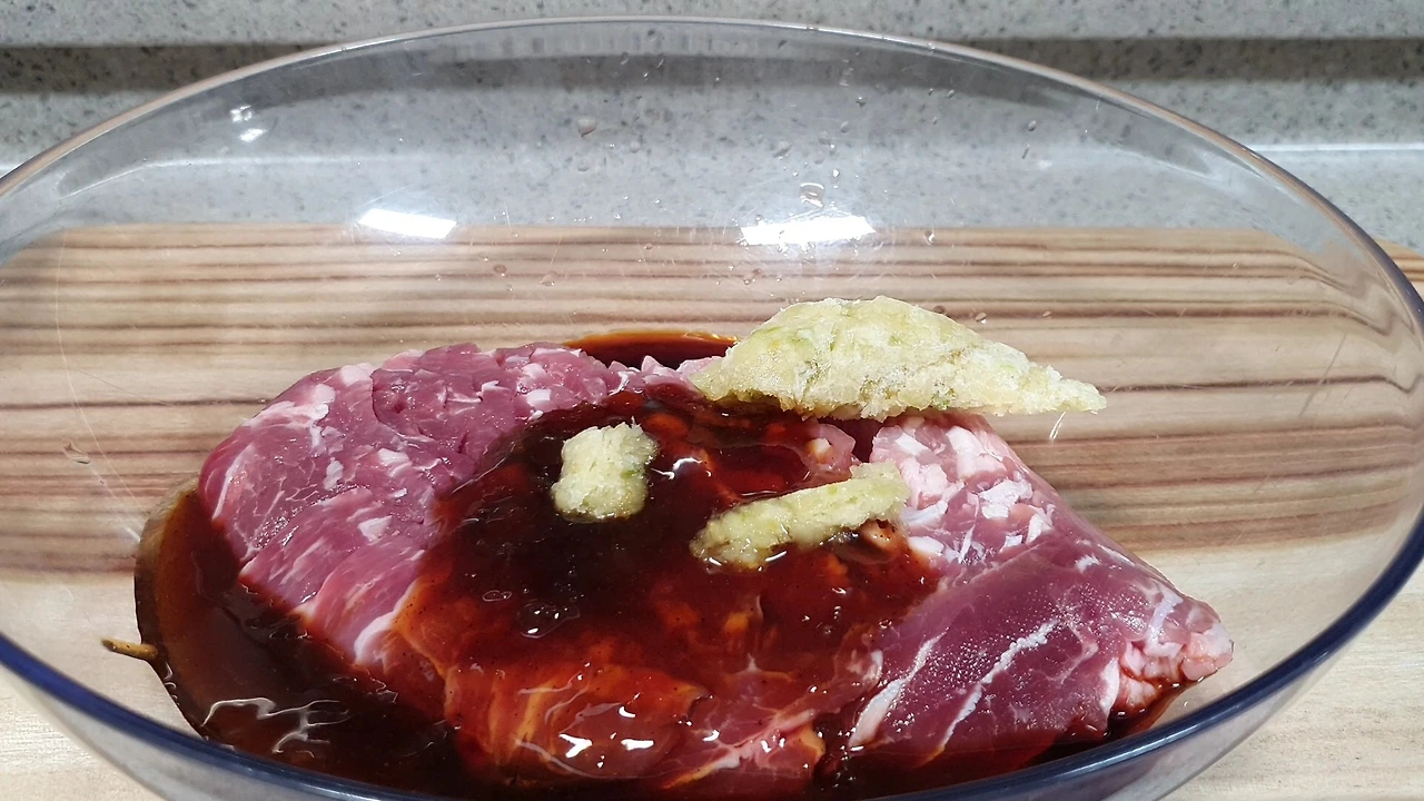 양념재료 : 식용유 2스푼 소불고기 양념 5스푼 간장 4스푼 마늘 1스푼 맛술 2스푼