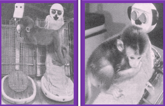 Harlow와 Zimmerman은 새끼 원숭이들을 태어났을 때부터 어미에게서 떼어 놓고 대리모와 6개월 동안 지내도록 했어요. 대리모 중 하나는 철사로만 만들어졌고, 나머지 하나는 철사 위에 부드러운 천이 덮여 있습니다. 배고픈 아기 원숭이는 철사로 만들어진 대리모에게서 우유를 먹는 시간을 제외하고 하루종일 천 대리모에게 안겨있었다고 해요.
