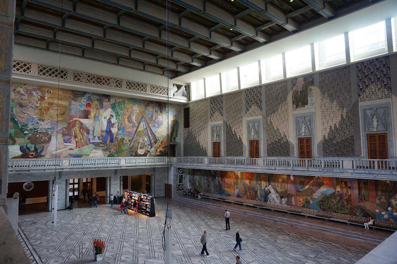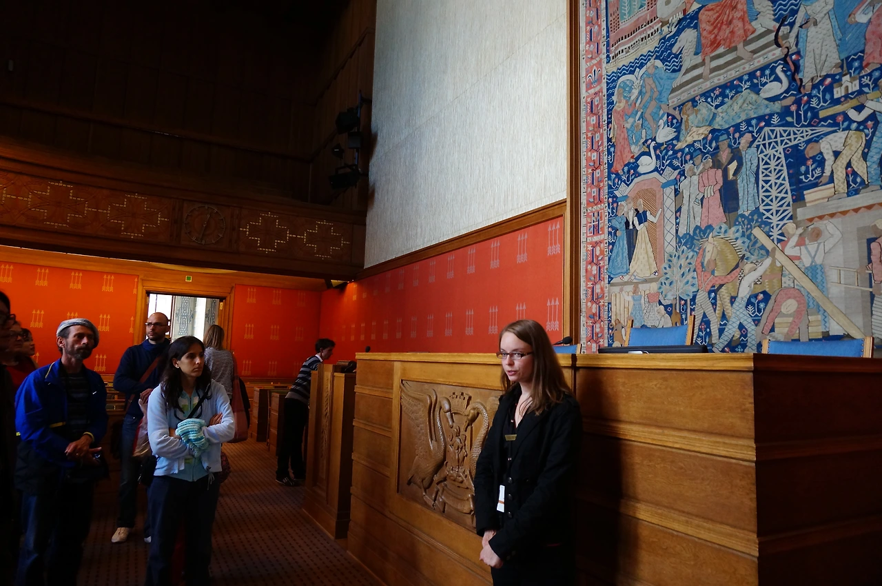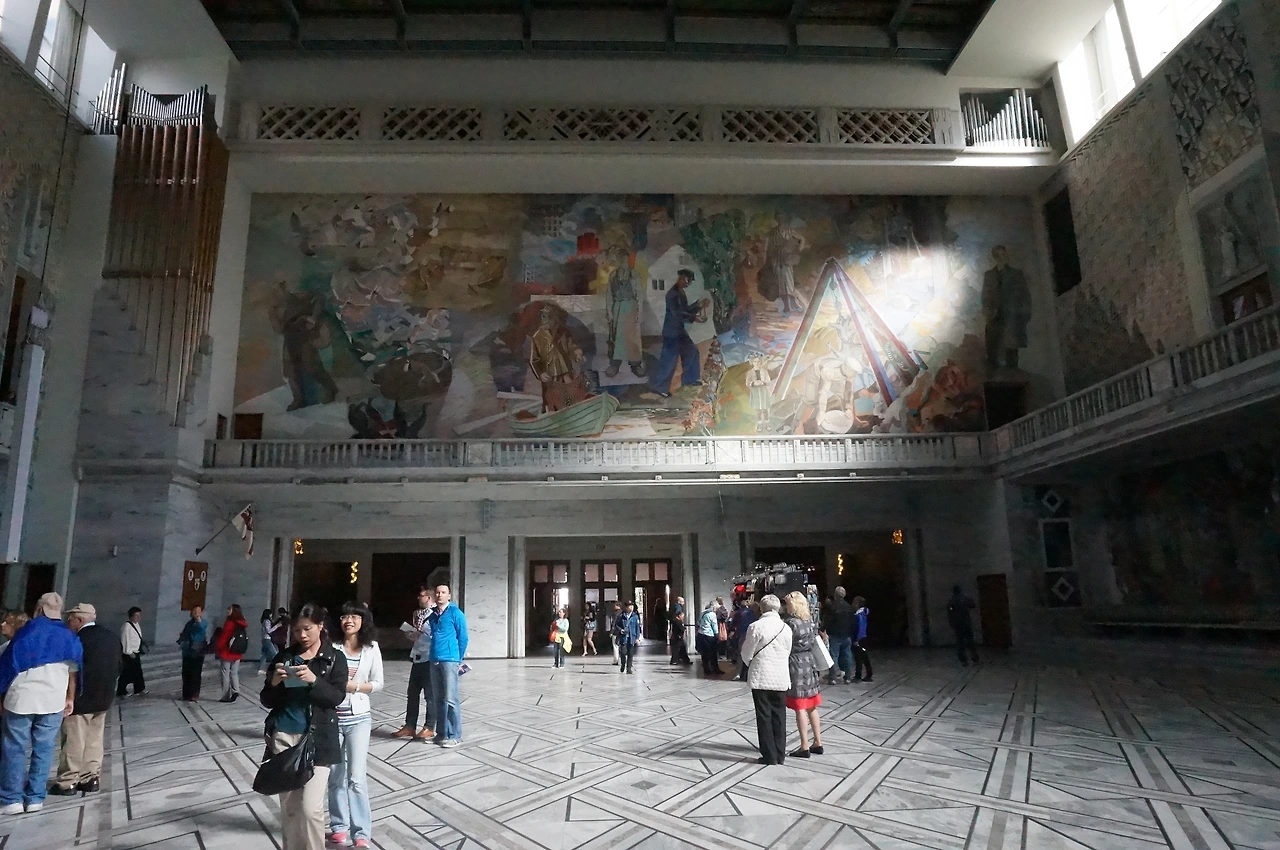 나는 금발의 귀여운 가이드를 따라 시청사를 돌아보게 되었다. 오슬로 시 창립 900주년을 기념해 세운 시청사 안에는 유럽에서 가장 커다란 유화가 있다. 가이드는 벽화에 담긴 의미와 작가에 대해 하나하나 자세히 설명하며 오슬로와 노르웨이의 역사에 대해 설명했다. 노르웨이를 지배했던 덴마크를 트롤로 표현한 작품에선 혹시 여기 덴마크분이 있냐고 묻더니 덴마크 관광객들에게 가벼운 농담과 인사를 건네는 등 꽤 노련한 모습을 보였다.