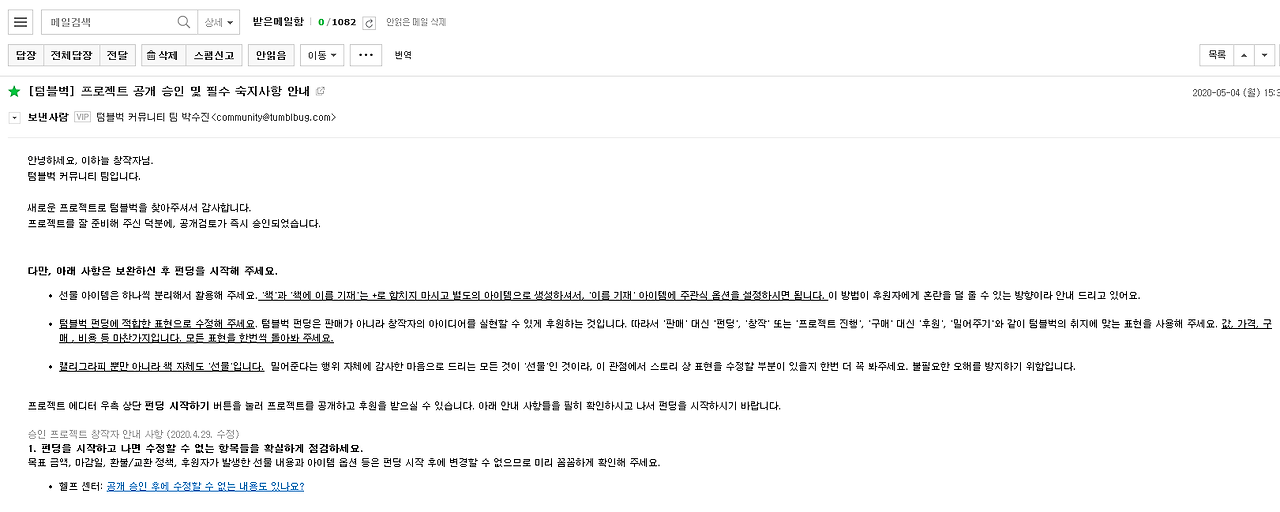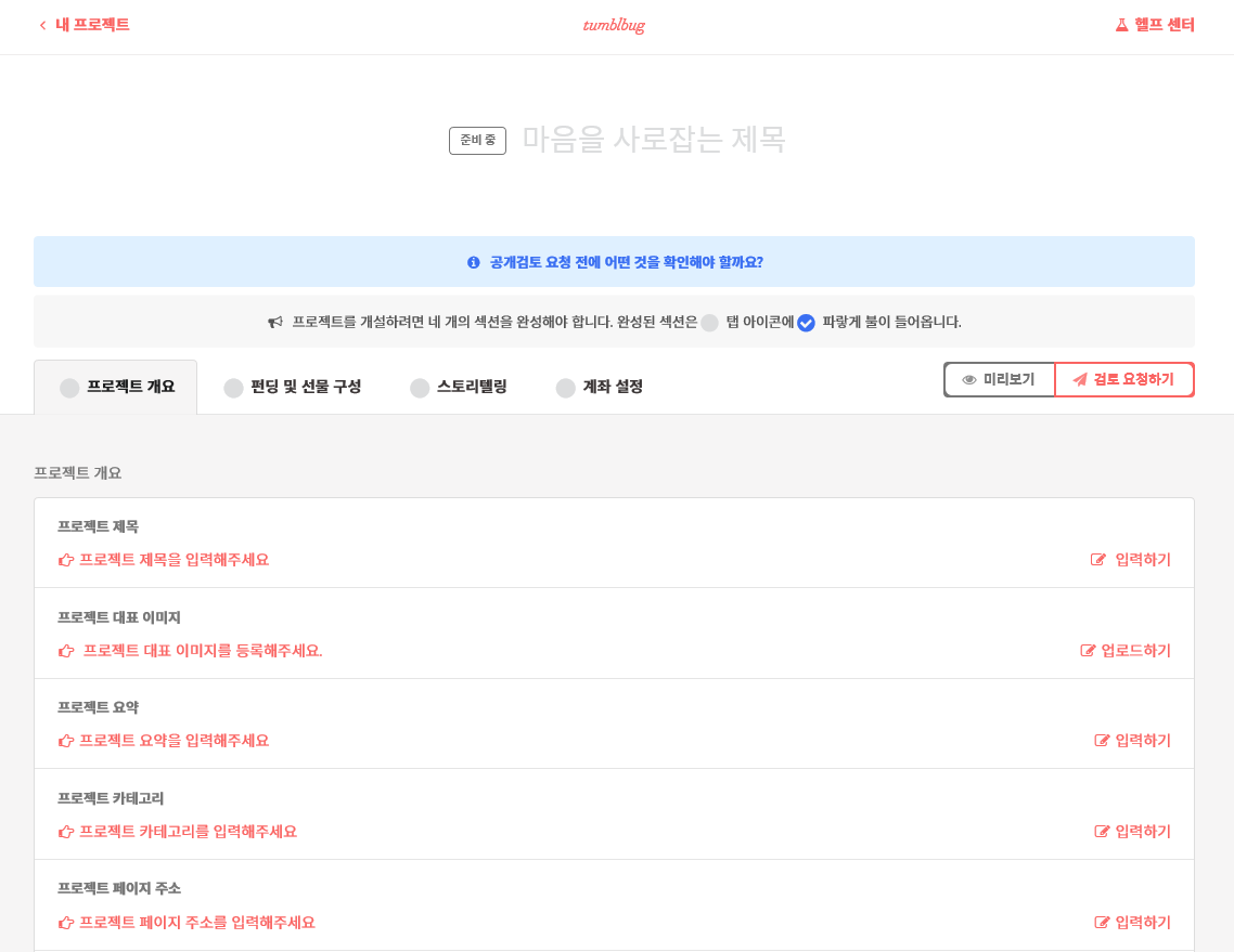 하루 만에 프로젝트 섹션을 모두 완성할 수 없다. 물론 가능한 능력자분들도 계시겠지만, 따로 저장버튼이 없었던 걸로 기억하는데 걱정 마시라. 화면을 나가도 자동으로 저장됐던 것 같다. 그렇게 일주일 정도를 고심해서 내용을 채우고, 이미지를 채우고, 기간도 설정하고, 가격도 정하고 하다 보니 드디어 네 개의 섹션에 파란 불이 들어왔다. 두근대는 마음으로 검토 요청하기를 눌렀다. 승인 내용은 메일로 받아볼 수 있는데 일주일 정도 걸린댔는데 주말이 지나고 바로 승인이 났다. 간단한 보완사항만 수정하라는 코멘트를 달아주시고 프로젝트를 실행해도 좋다는 승인이었다. 상품을 판매하는 것이 아닌 아이디어를 실현할 수 있게 밀어주고 후원해주는 단어를 사용하라는 텀블벅의 취지가 좋았다. 나의 마음가짐을 다시 한번 점검하며 단정하게 해주는 기분이었다.