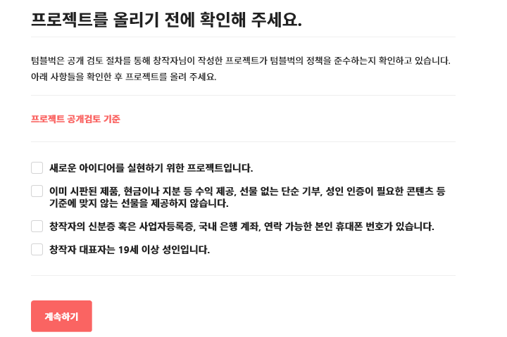 출판 인쇄소 대표님과 책에 대해 컨설팅을 받았고 크라우드 펀딩을 진행하기 위해 1차 제본을 맡겼다. 샘플 본을 받아봐야 판형이나 실물에 대한 상세 정보를 기재할 수 있기 때문이다. 샘플 본을 받아봤는데 생각보다 너무 예쁘게 나와서 아주 만족스러웠다. 실물은 3,4일이면 받아볼 수 있었다. 그 주 주말에 내 책과 어울린만한 카페를 몇 군데 정하여 촬영 날을 잡았다. 카메라는 취미로 2014년에 구입했던 Cannon EOS 700D 모델을 사용했다. 홍보영상은 선택인데 혹시 필요할까 하고 촬영을 해두었다. 실물과 표지와 내지 사진이 준비되었다면 텀블벅 홈페이지로 들어간다. 자세히 알아보니 홈페이지에서 나의 프로젝트에 대해 승인을 받아야 했다. 회원가입을 하면 내 페이지가 있다. 여기서 프로젝트 올리기로 들어가면 아래와 같이 프로젝트 공개 검토 기준이 뜬다. 기준에 해당된다면 계속하기를 클릭한다.