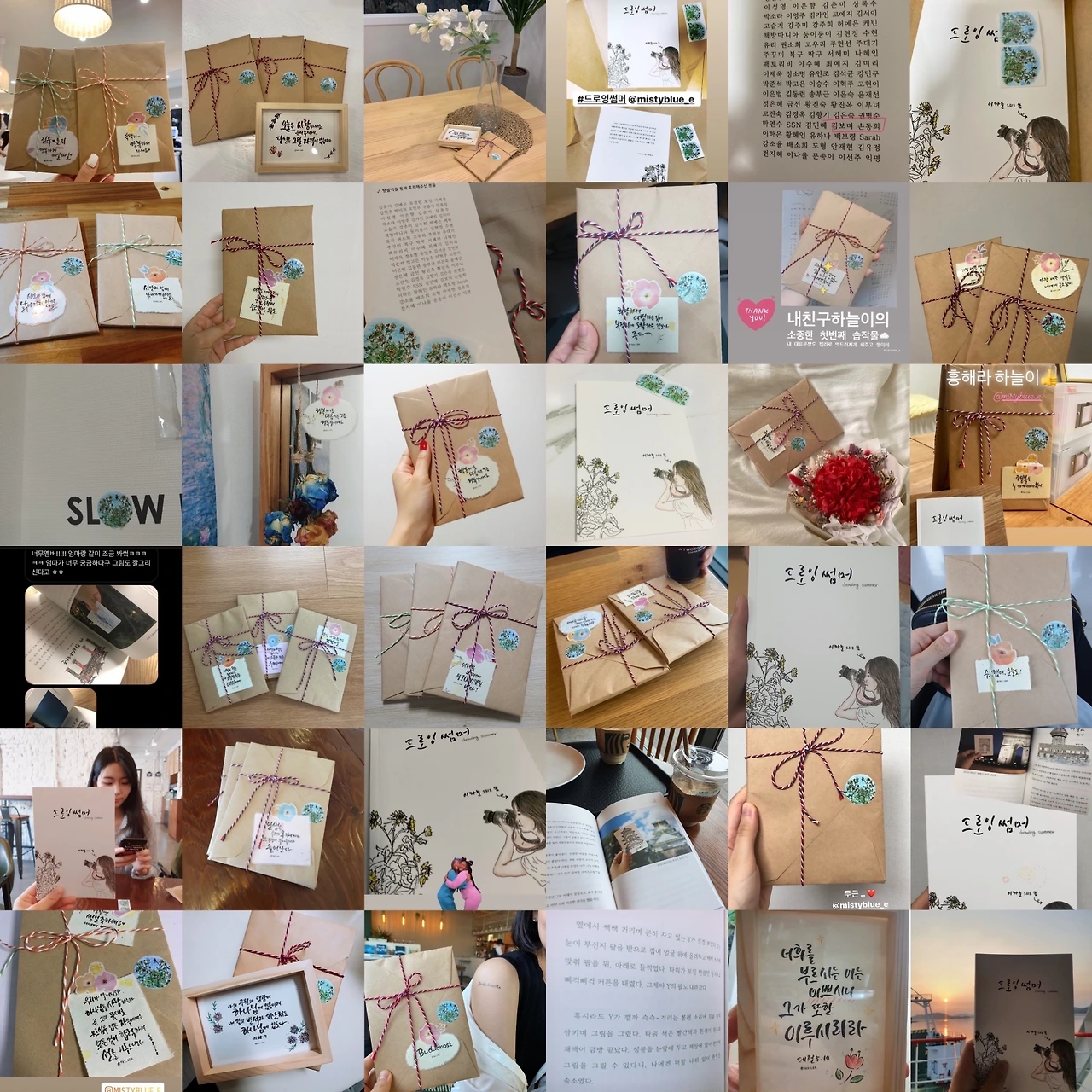 펀딩 마감 후 중요한 것은 포장 및 배송 업무인 것 같다. 얼마나 약속한 시일 내에 후원자들에게 안전하게 선물을 전달하는가 하는 것. 배송기간을 좀 넉넉하게 잡은 것도 있었고, 펀딩을 진행하는 3주 동안 캘리그래피 같은 굿즈 작업을 미리 해두었다. 책 포장도 고민이 되었는데 평소 크라프트의 빈티지함을 좋아하기도 하고 환경을 생각해서 종이포장을 할 생각이었다. 크라프트지에 스트라이프 끈을 묶은 책 포장을 눈여겨보았다가 비슷한 재료를 준비했다. 혼자서 100건이 넘는 포장작업을 할 생각을 하니 눈앞이 깜깜했지만, 다행히도 주변에서 도와주겠다는 친구들의 고마운 마음도 있었고 손재주가 좋으신 선생님의 도움으로 정말 수월하게! 포장작업을 마쳤다.