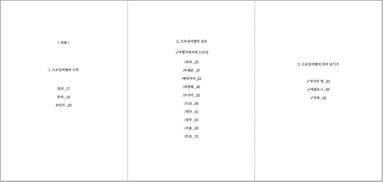책을 볼 때 표지를 보고 호기심에 손을 뻗었다면 그다음으로 보는 것은 일반적으로 목차이다. 어떤 작품이든 오프닝과 엔딩이 있는 것처럼 책의 목차는 보통 프롤로그(prologue: 1. 책의 첫머리에 서문 대신 쓴 시.)와 에필로그(epilogue:1. 시가, 소설, 연극 따위의 끝나는 부분.)로 구성되는 것이 기본이다. 잘 모르겠다면 모티브로 하고 싶은 책 몇 권을 정해서 목차를 참고하면 좋다. 우리는 독립출판을 하는 것이므로 저자의 취향대로 얼마든지 변형이 가능하다. 그림으로 목차를 구성해도 되고 심플하게 선으로 또는 일자로 나열해도 된다. 나는 정말 기본 형식으로 시작-실천-의미 남기기로 구성하여 세 가지 섹션으로 크게 나누었다. 첫째, 드로잉 여행의 시작에서는 정의, 준비물, 포인트의 내용을 다루었다. 둘째, 드로잉 여행의 실천에서는 실제로 내가 드로잉 했던 여행지(10곳)의 짧은 글과 그림, 사진을 다뤘다. 셋째, 드로잉 여행의 의미 남기기에서는 작가의 말과 에필로그 속 사진을 자유롭게 배치하여 좀 더 자유롭게 책의 의미를 생각해 볼 수 있도록 구성했다. 개인마다 다르겠지만 나는 목차를 먼저 생각하고 글을 썼다. 대충 어떤 순서로 전개할지 큰 그림을 그리고 세부적으로 접근하는 게 편해서.