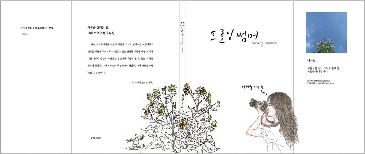 표지는 가장 마지막에 디자인 및 제작했다. 책의 내용이 어느 정도 가다듬어졌을 때 책의 페이지 수에 따라 책 등 높이도 계산할 수 있고 함축적인 의미를 담아 책의 제목과 표지 전체를 디자인할 수 있기 때문이다. 가운데 책등을 기준으로 앞면과 뒷면이 있는 3등분이 기본 구성이다. 여기에 조금 더 신경을 쓴다면 책날개(우리가 책갈피처럼 사용하는)를 추가한다. 책날개 앞쪽에는 보통 작가 소개가 들어간다. 나는 내 이름을 상징하는 하늘과 여름의 대표적인 꽃인 해바라기를 대표 사진으로 소개했다. 표지 그림에도 들어가서 통일감도 주고, 아주 좋아하는 그림이다. 책은 5면을 선대로 나누지 않고 걸쳐서 디자인했다. 책 표지 만드는 것은 크기가 다른 면들을 이어 붙여야 하므로 인디자인을 사용하는 것을 추천한다. (물론 다른 문서로 만드는 방법도 있다고 한다.)