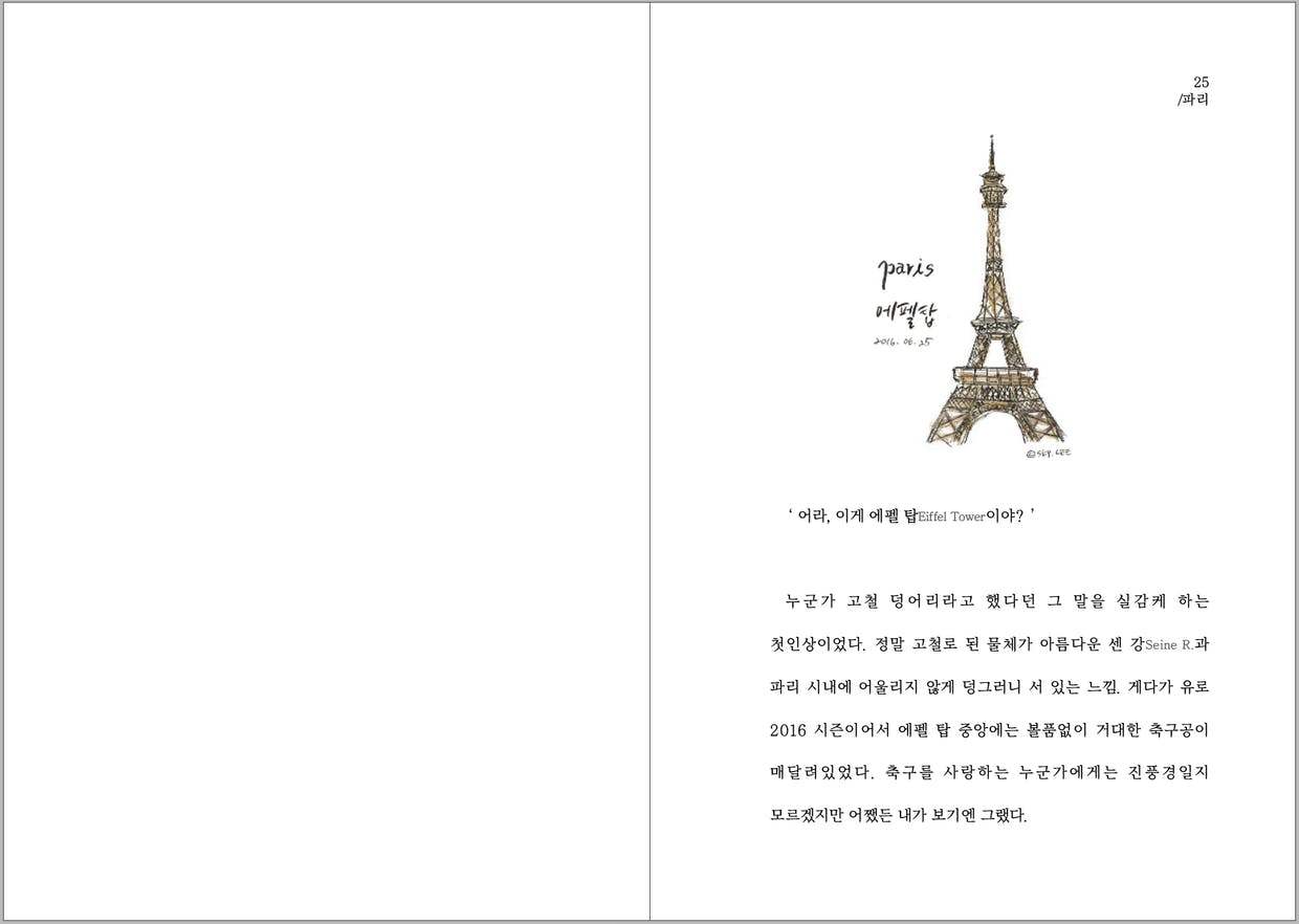 그런데 여기서 팁이라면, 일단은 편집 내용을 생각 않고 글을 적어 내려가지만 레이아웃은 먼저 설정하는 것이 중요하다. 레이아웃(사진과 그림의 적절한 배치)에 따라 책의 구성이나 전달력, 통일성 등이 좌우되기 때문이다. 내가 정한 레이아웃은 따로 소제목을 적지 않고 드로잉 한 그림을 그대로 실었다. 드로잉+약간의 글/ 글/ 글/ 사진/의 4배치가 기본 구성이었고 중간의 글의 양에 따라 페이지가 늘어날 수 있도록 했다.