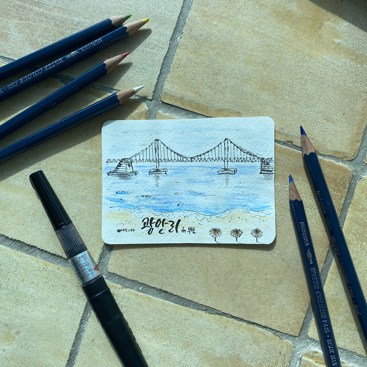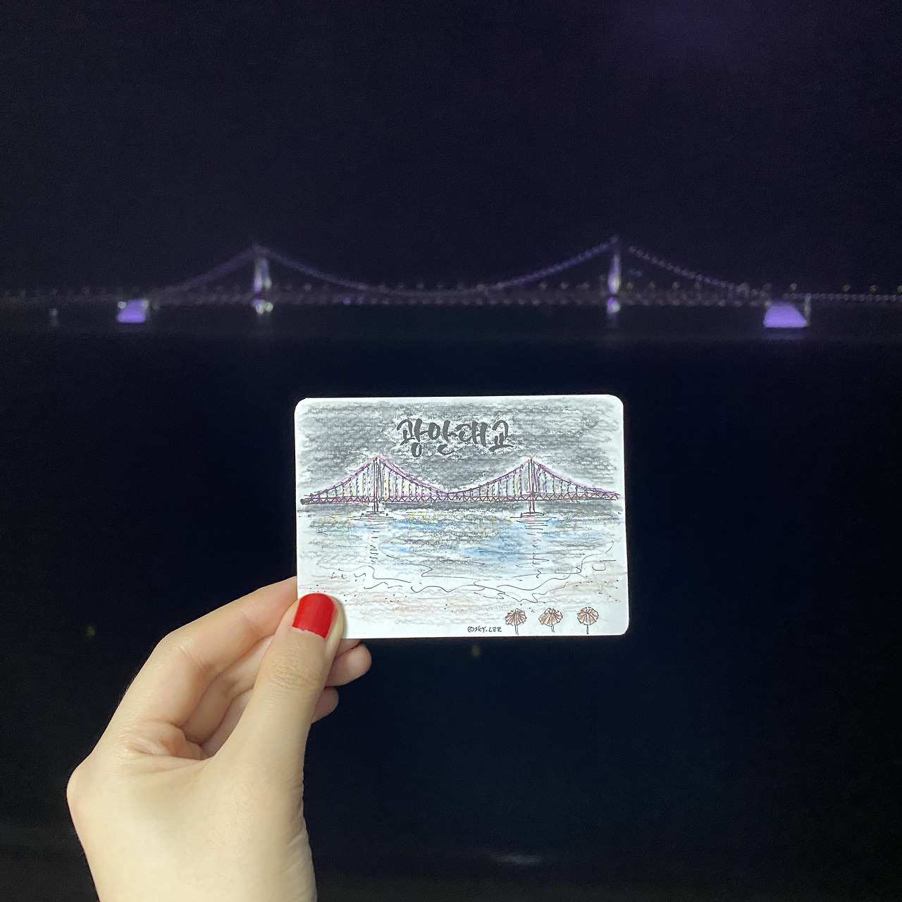 숙소로 돌아오니 우산이 소용없을 정도로 엄청난 폭우가 내렸다. 우린 안전했다. 밖에 더 돌아다닐 수 없어 아쉬웠지만 숙소에서 다시 우리만의 수다파티가 열렸다. 여행을 마무리하며 같이 찍은 사진을 구경하고 우리의 웃음소리는 계속됐다. 아쉬움에 비 오는 광안대교의 밤바다를 드로잉 했다. 그래도 이번 여행이 만족스러운 것은 날씨도 맛있는 음식도 멋진 카페도 아니고 마음이 맞는 친구와 소소한 여유를 공유했다는 것이었다. 내가 좋아하는 책방이며 드로잉도 할 수 있었고 친구가 좋아하는 드라이브도 했다. 개인의 시간과 함께의 시간 둘 다 있어서 참 좋았던 것 같다.