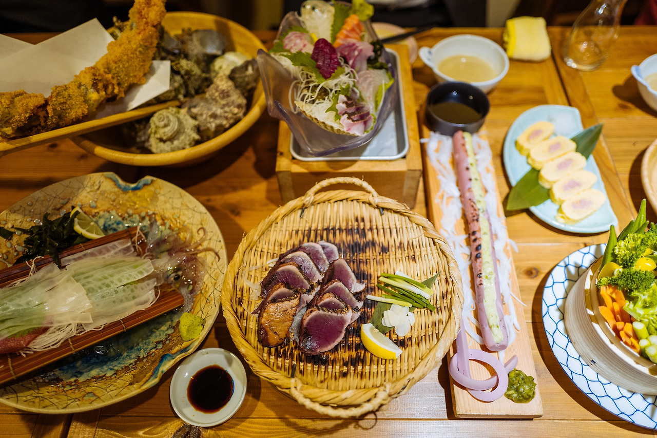 오늘따라 유난히 빨리 저문듯한 하루의 아쉬움을 달래는 데는 다양한 후쿠오카 특선 요리를 한 자리에서 맛볼 수 있는 이자카야가 제격입니다. 가게 앞 잔뜩 늘어선 줄에 계획에 없던 식당을 들어서고 그곳에서 잊을 수 없는 요리를 맛보게 된다면 그것만으로도 그날 하루 어쩌면 여행 전체가 성공한 것 같지 않을까요. 살아 움직이는 오징어 회와 50cm가 넘는 우엉 튀김, 단돈 500엔짜리 모둠회에 눈이 휘둥그레진 그 밤이 그랬습니다. 가득 차려진 한 상이 프레임에 다 들어오지 않아서 몇 발짝이나 뒷걸음질을 한 후에야 사진을 찍을 수 있었으니까요.