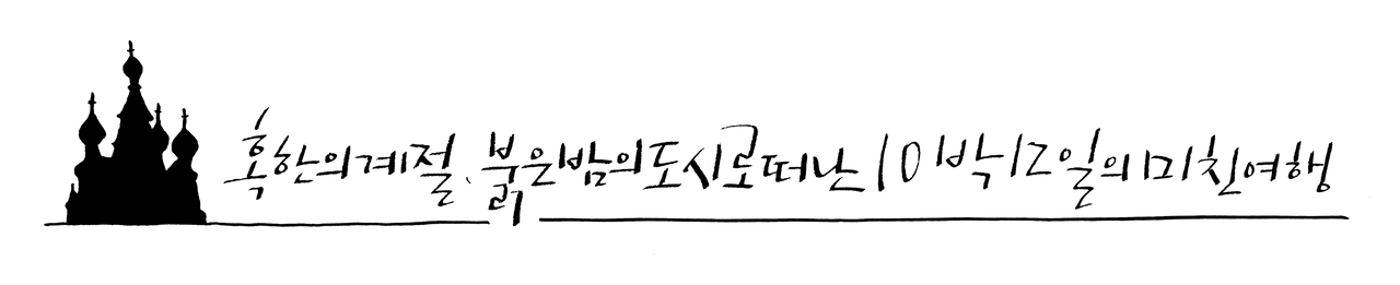 그렇게 제 앞에 두툼한 종이뭉치 하나가 놓였습니다. 글은 물론 제목도 없는 완전한 백지로. 모스크바 여행 이야기는 그렇게 처음부터 새롭게 시작됐습니다. 돌아보면 꼭 그 여행처럼 무모했던 것 같아요.