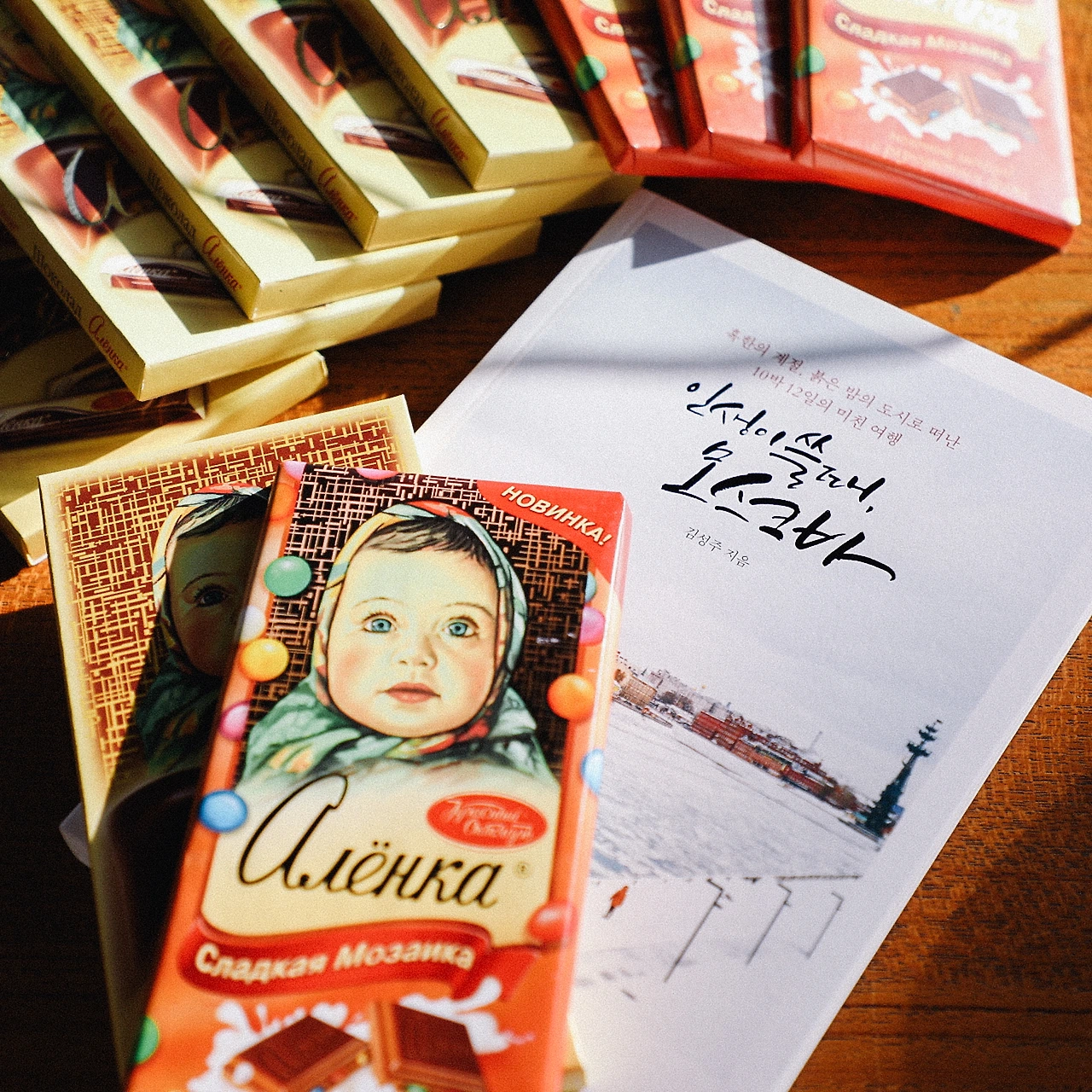 책을 읽으시면서 함께 하기 좋은 것을 생각하다 모스크바에서 보았던 초콜릿을 떠올리게 됐습니다. 혹한과 폭설이 이어진 그 도시에서 제가 가장 간절히 원했던 것 중 하나이기도 했습니다. 흔쾌히 책을 선택해 주신 분들을 위한 작은 보답이니 부담 없이 받아주세요. 아, 되도록 많은 분들께 드리기 위해 초콜릿은 하나씩 보내 드리려고 합니다.