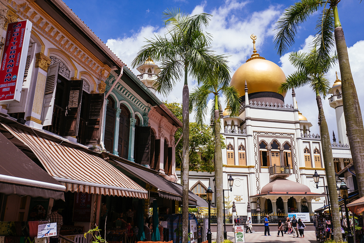 이름난 쇼핑 타운 중 하나라는 부기스(Bugis) 역에 내려 거대한 건축물 래플스 병원(Raffles Hospital)을 따라 돌았을 때, 횡단보도 건너 낯선 풍경에 괜히 주변을 한 번 더 둘러보게 됩니다. 숙소가 있는 오차드 로드(Orchard Road)를 나선 삼십여 분 전까지만 해도 이런 거리가 싱가포르 안에 숨어있을 거라고 생각하지 못했거든요. 그리고 파란 신호등 불을 따라 횡단보도를 건너는 동안 마치 국경을 넘는 것처럼 재미있는 변화들이 일어났습니다. 독특한 향신료 냄새가 나기 시작했고, 비취색과 보라색 같은 과감한 색이 칠해진 건물들이 눈에 띄었습니다. 히잡을 쓴 여성들과 몇 번 눈이 마주치고 나니 정말로 다른 도시에 온 듯한 기분입니다. 그 길로 몇 걸음 위, 우아한 실루엣의 이슬람 사원이 낯선 여행자를 맞이합니다.