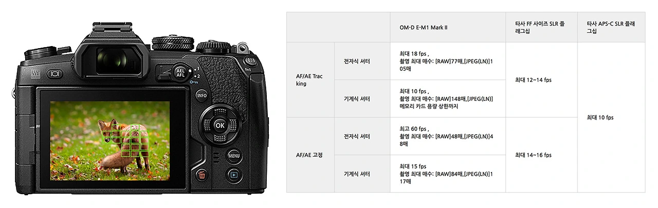 올림푸스가 E-M1 Mark II를 앞에 두고 가장 하고 싶은 이야기가 ‘속도'일 것입니다. 그리고 그걸 좀 더 설명해보라 하면 고속 AF와 연속 촬영에 대해 침을 튀며 말하겠죠. E-M1 Mark II를 통해 E-M1 그리고 OM-D 시리즈의 격을 한 단계 높이고 싶었던 올림푸스는 121개의 크로스 타입 위상차 AF 센서를 배치해 전에 없던 속도를 갖게 됐습니다. 특히 움직이는 피사체를 추적하는 AF-C 동체 추적 연사에서 그 진가가 드러나는데, 실시간으로 피사체를 따라가는 AF 포인터가 화면에 표시돼 신뢰할 수 있습니다.