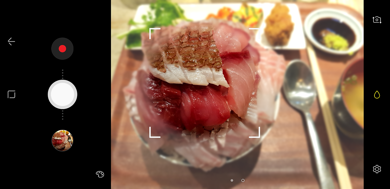 음식 모드의 사진은 채도가 높고 따뜻한 색감의 WB를 적용해 음식이 더 선명하게 보입니다. 붉은 생선살이 더 진하게 보이는 것만으로도 음식 사진으로서 완성도가 더 올라가는 것을 체감할 수 있습니다. 초점을 맞춘 생선회 부분 주변은 블러 효과가 적용돼 주인공인 음식이 더 부각됩니다.
