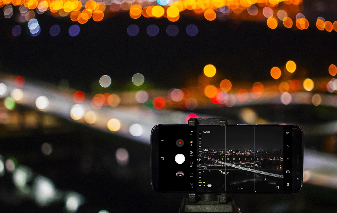 셔터 속도는 1/24000초부터 최대 10초까지 설정할 수 있습니다. 셔터 속도를 조절해 빠르게 움직이는 피사체에 대응하거나 노출을 제어할 수 있죠. 특히 야간에 1초 이상의 긴 셔터 속도를 설정하고 삼각대로 스마트폰을 고정시키면 디지털카메라에서나 가능하다고 생각했던 장노출 촬영도 시도할 수 있습니다. 이때 ISO 감도 조절 탭에서 최소 ISO 50을 설정하면 깔끔한 결과물을 얻을 수 있습니다.