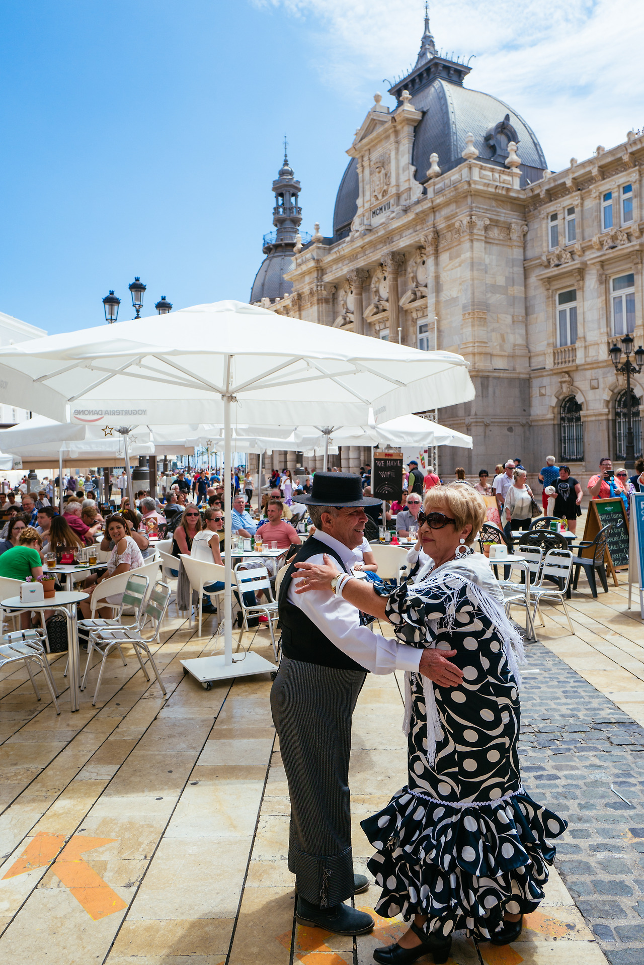 관능적인 실루엣의 드레스에 머리에 꽃 장식을 단 부인들의 춤이 시작됐어요. 처음엔 그녀들끼리 손을 맞잡고 박자를 타는 듯싶더니 얼마 지나지 않아 지긋한 노신사들이 그녀들의 손에 이끌려 나왔죠. 서너 쌍의 커플은 몇 차례 숨을 고르더니 이내 우아한 몸짓으로 노천카페의 테이블 사이를 구석구석 휘저었어요. 아주 능숙한 춤사위였죠. 관객석에서는 박수와 환호가 흘러나왔어요. 그 순간 제가 시 의회 건물, 그러니까 칼레 시장 쪽 골목 입구에 서있었던 것이 얼마나 큰 행운이었는지 몰라요. 그 황홀한 장면을 한눈에 모두 담을 수 있었으니까. 의심의 여지없이 그 날 축제의 하이라이트였습니다.