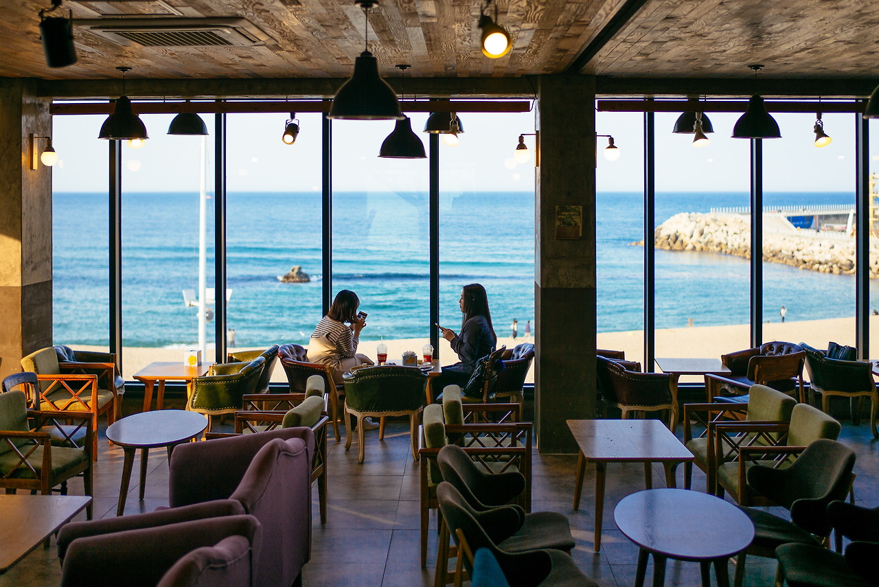 사람이 많지 않은 평일 오후, 3층 창가 4인 좌석을 독차지하고 소파에 반쯤 드러누운 최대한 편한 자세로 창 밖에 펼쳐진 해변을 바라보았습니다. 모래사장 방향으로 손가락을 들어 조금 전까지 앉아있던 지점을 찾아보기도 하고요. 해변이 아직 사람들로 붐비지 않는 것, 부두며 골목들이 그때와 다르지 않은 것 모두 다행이라는 생각이 들었습니다. 다음에 다시 찾았을 때도 변함없기를 기대할 수 있으니까. 지인들에게 ‘커피 마시러 강릉 왔어.’라고 한바탕 거드름을 부리고 나서 적당히 식은 커피를 마셔봅니다. 따뜻하고 구수해서 어르신들이 드시기 좋을 것 같은 커피는 사실 여기까지 찾아 올 정도인지는 모르겠습니다만, 내려놓은 오렌지 색 컵 너머로 보이는 오션 뷰에 이 정도야 뭐 아무래도 괜찮다 싶더라고요.