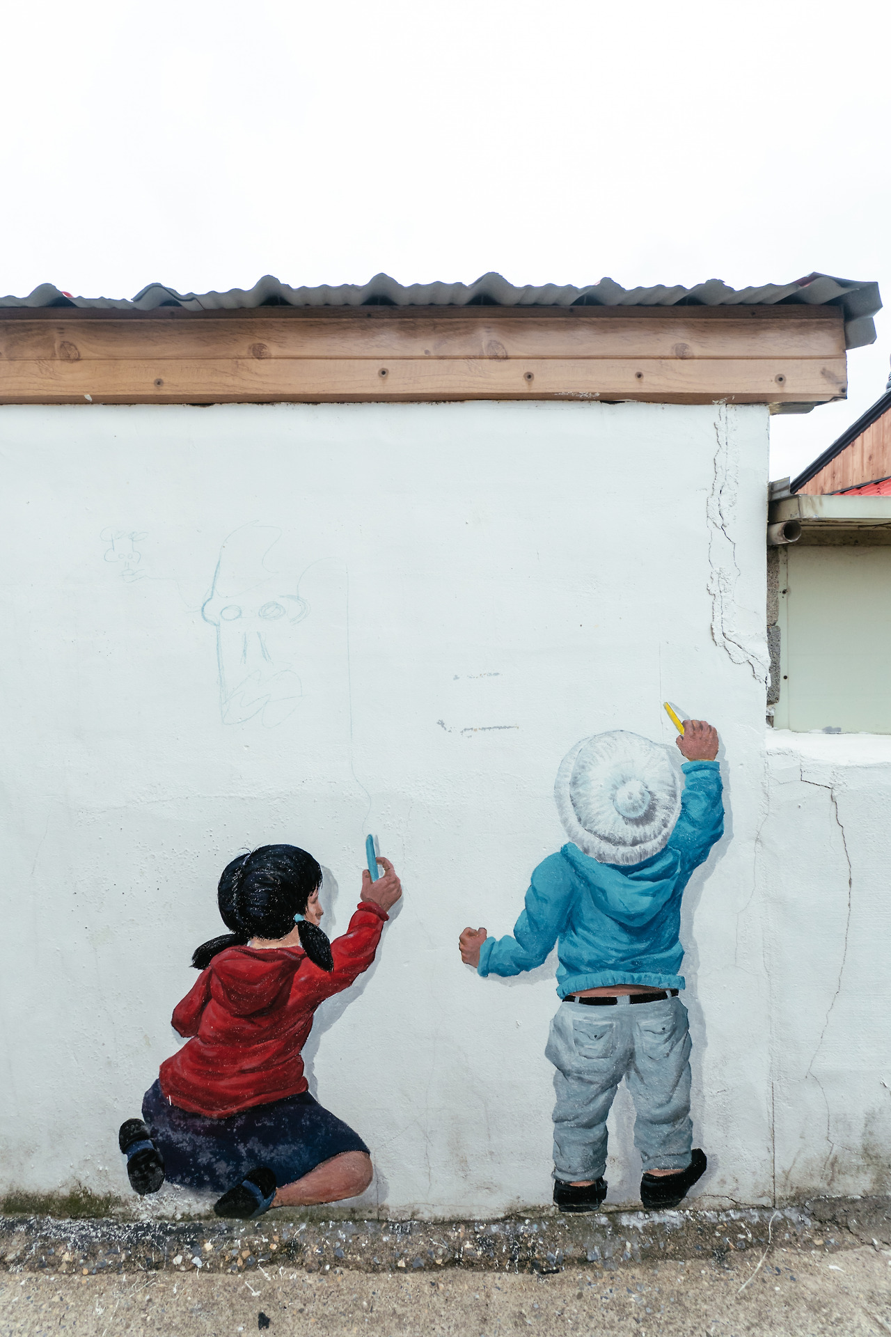 그 후 골목의 그림이 하나씩 늘어났습니다. 등대 그림이 그려진 벽 바로 옆에 그려진 물고기 세 마리 그림을 시작으로 거북과 문어, 고깃배, 소나무까지. 새로운 그림을 따라 매일 골목 안쪽을 살펴보는 것이 어느새 소녀의 아침 일과가 됐죠. 보름쯤 지난 후 어김없이 새 그림을 찾아 골목 안쪽으로 들어선 소녀 눈에 띈 것은 벽을 가득 메운 물고기 떼였습니다. 물고기 떼가 가리키는 방향을 따라 걷던 소녀는 어느덧 골목 끝에 다다랐고, 그 끝엔 자신을 닮은 여자 아이가 쪼그려 앉아 무언가를 그리는 그림이 있었습니다. 그 옆에 서 있는 그림을 보자 소녀는 피식 웃음이 나왔습니다. 누구인지 대번에 알아보았거든요.