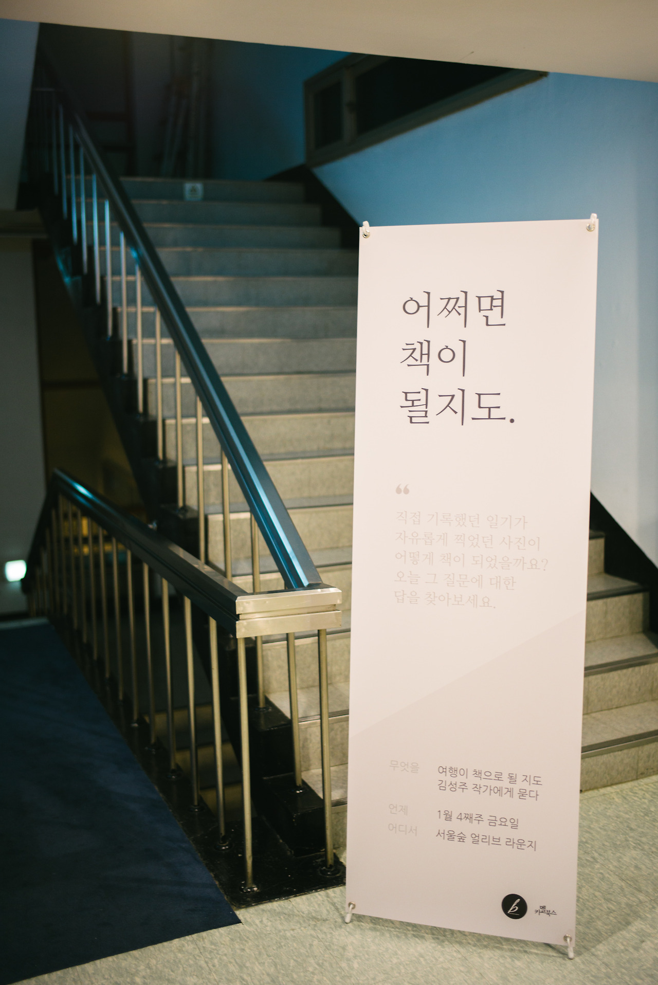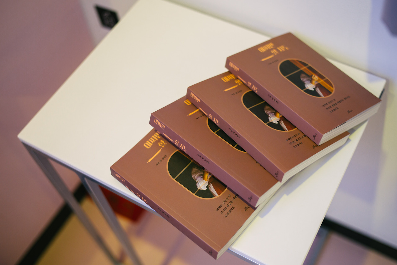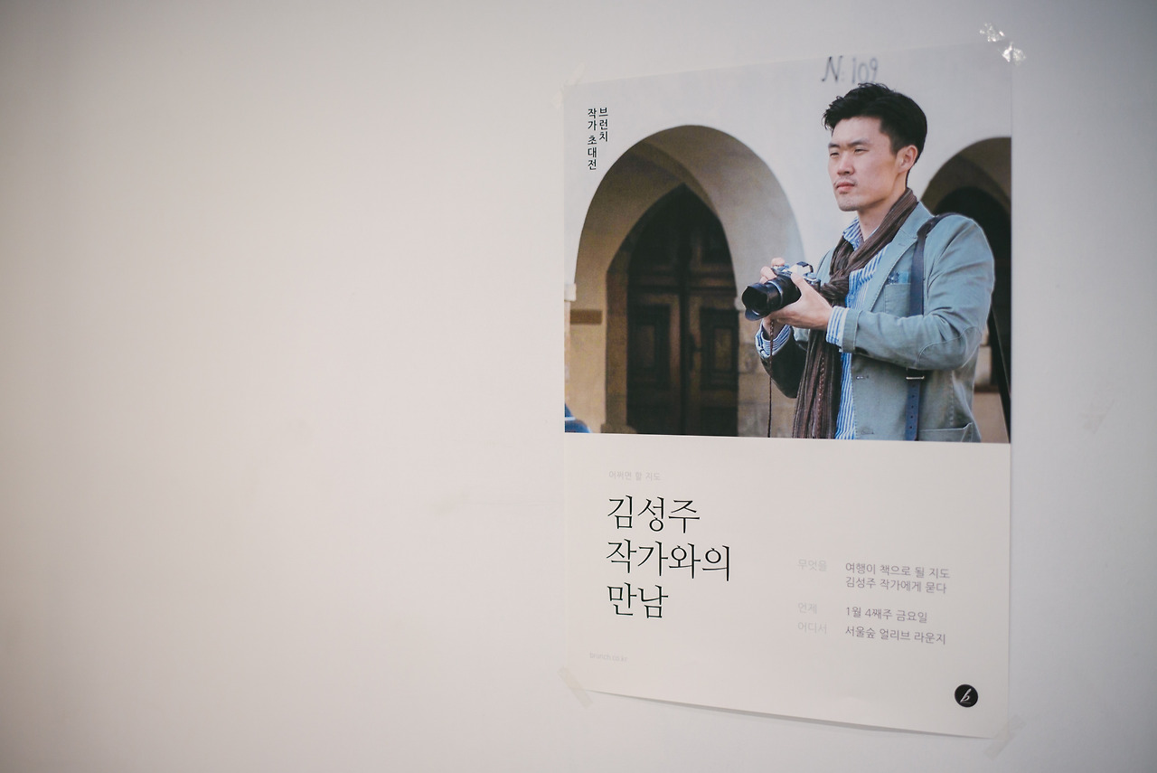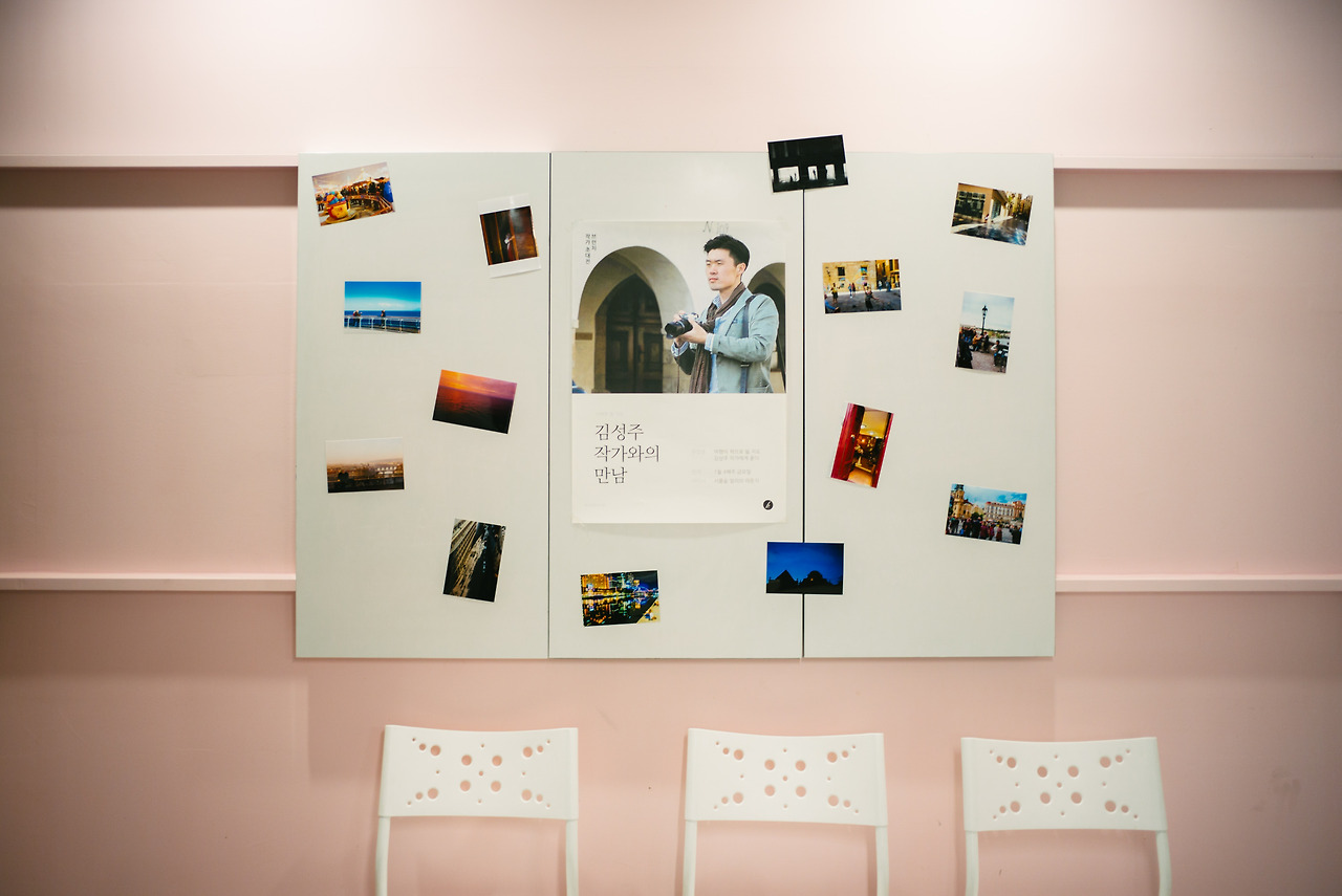 서울숲 얼리브 라운지에 도착한 건 약속된 시간보다 한 시간쯤 전이었지만 저보다 먼저 오신 카멜북스, 얼리브 라운지 관계자분들이 사진과 포스터, 책으로 강연장을 꾸미고 계셨습니다. 그간 제가 찍은 사진들이 액자에 담겨 전시됐고, 입구와 벽면에 제 얼굴이 붙었습니다.