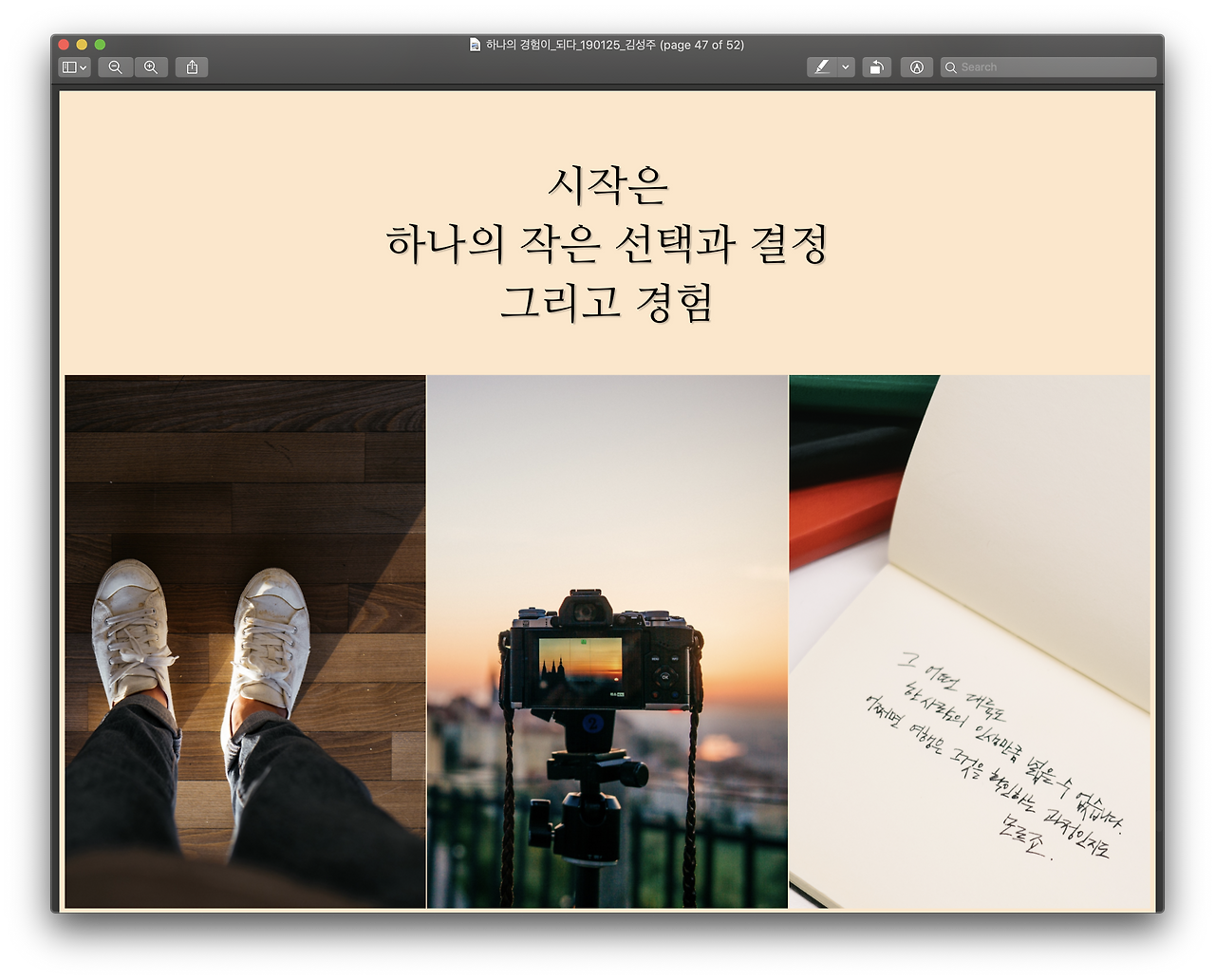 강연회의 제목인 ‘하나의 경험이 _ 되다’라는 문장을 저는 ‘하나의 경험이 내 이름이 되다’로 채워 보았습니다. 그리고 방황하던 시기에 우연히 발견한 한 장의 사진, 그렇게 무작정 떠난 한 번의 여행과 그곳에서 남긴 한 줄의 메모가 브런치를 통해 이야기가 되고, 책으로 출간되며 언젠가 막연히 꿈꿨지만 기대하지 않았던 작가라는 이름에 한 걸음씩 가까워지고 있는 제 이야기를 털어놓았습니다