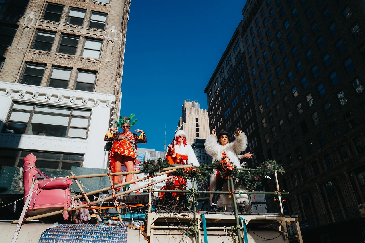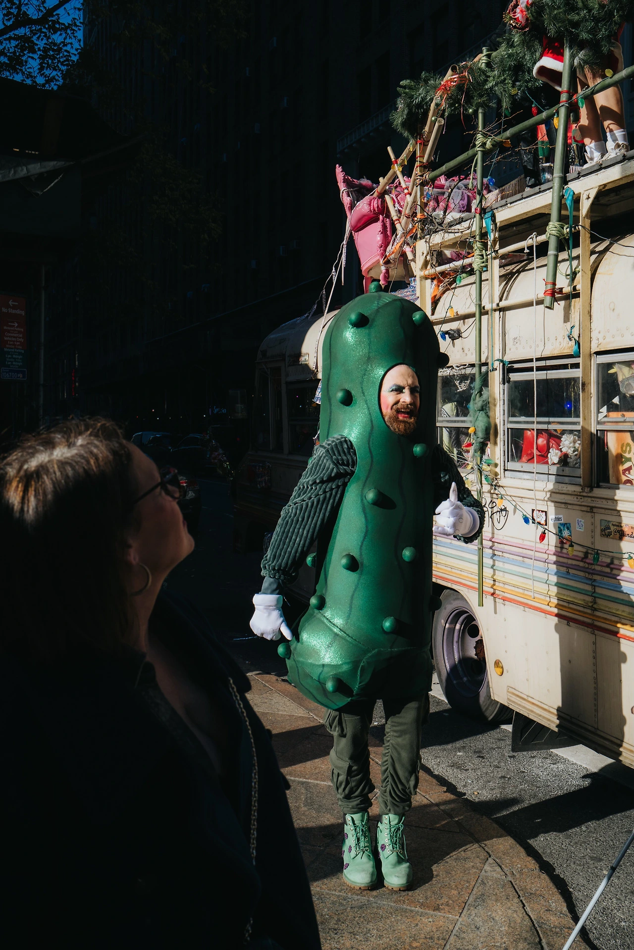 참가비도, 드레스 코드도 맞추지 않았지만 메인 무대가 맨해튼 길바닥이었던 덕에 나도 두어 시간 이 골목 저 골목 쑤시고 다니며 곁다리나마 축제를 즐겼다. 빨간 옷 입은 사람들 보이면 말 한마디라도 나눠 볼까 쫓아가 보고 술집, 식당 앞에 모여있는 사람들 앞을 어슬렁대기도 했다. 메이시스 백화점 근처 대로변을 지나가다간 한바탕 벌어진 춤판에 입이 떨 벌어졌다. 예쁜 장식들을 지저분하게 두른 트럭 위에서 춤사위를 뽐내는 여성들 그리고 오이 탈 뒤집어쓴 사내를 리더 삼아 사람들이 함께 노래하고 춤을 췄다. 기둥에 기대 감상하던 나도 어느새 어깨를 들썩들썩. 그래, 이게 내가 기대했던 뉴욕이고 맨해튼이지.