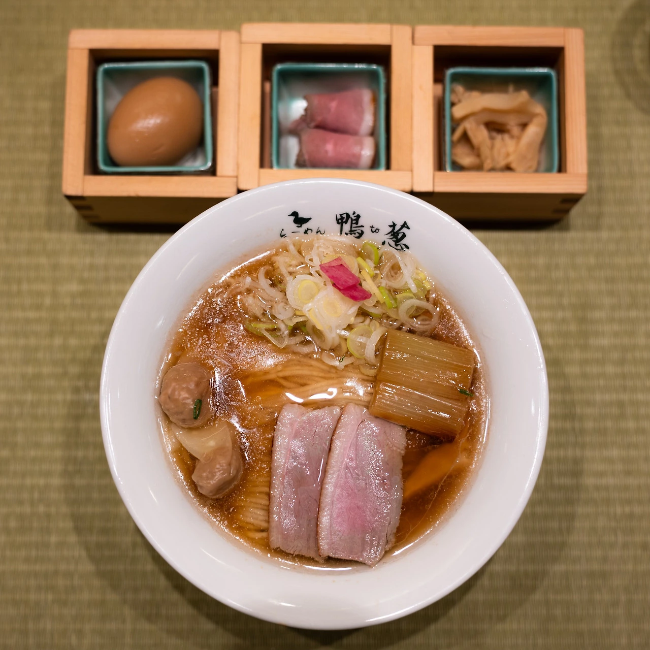 오리와 파를 내세운 라멘집입니다. '우리 육수에는 오직 오리와 파, 물만 들어 있습니다.'라고 말할 만큼 육수에 대한 식당의 자부심이 대단해요. 거기에 파와 물, 면에 사용되는 밀가루까지 모든 재료들을 일본산으로 엄선해 쓴다고 합니다. 저는 대표 메뉴인 오리 라멘에 토핑을 추가한 디럭스 세트를 주문했습니다. 토핑이 종류별로 담겨 라멘과 따로 나오는 것이 특징입니다. 라멘에도 오리 고기와 파 그리고 완탕이 기본으로 올라가 있고요.