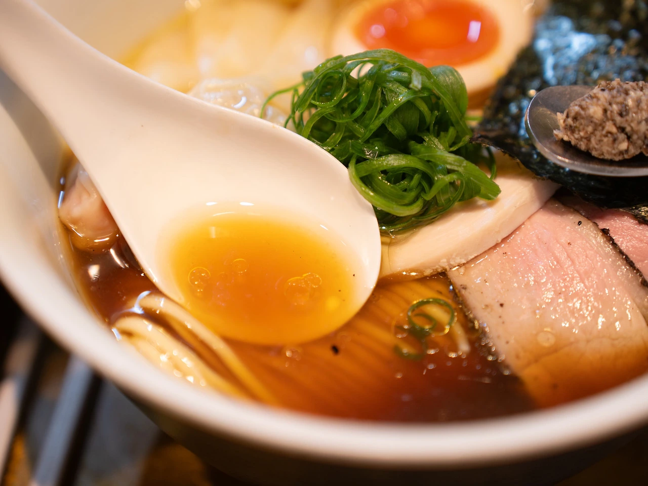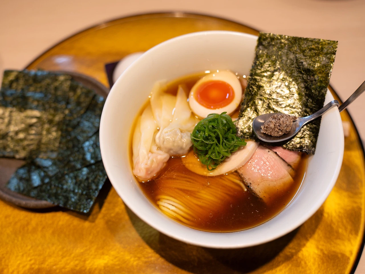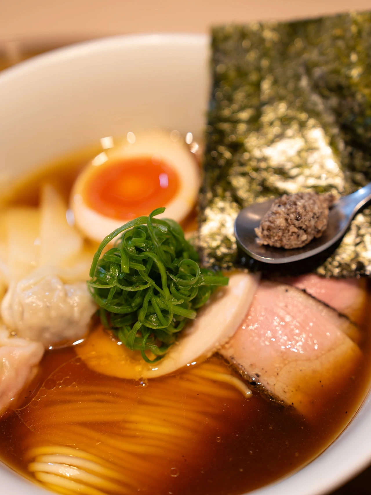 대표 메뉴인 얼티밋 포르치니 간장 라멘을 주문했습니다. 기본 포르치니 간장 라멘에 특제 토핑을 얹었고 가격은 2200엔입니다. 이 동네 물가 치고도 꽤나 비싼 라멘이에요. 그만큼 구성과 담음새가 근사하고요. 특히 색감이 다채로운 것이 마음에 들었습니다. 이 집의 킥은 스푼에 올린 포르치니 페스토입니다.