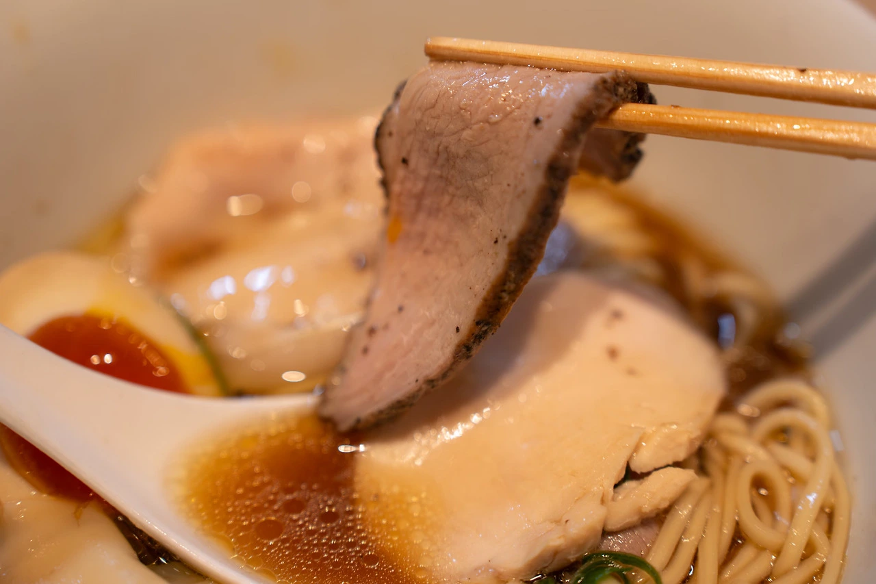 그들의 자랑인 역시 오리 육수는 맑지만 충분히 기름지고 고소한 맛이 강합니다. 거기에 파의 단맛과 감칠맛이 더해져 국물만으로도 꽤 괜찮은 요리입니다. 이 정도면 오리에 대한 호불호 관계없이 즐길만하단 생각이 들었어요. 면은 일반 중면인데 곡향이 제법 느껴졌습니다. 오리 육수와도 아주 잘 어울려서 배만 안 불렀다면 면을 추가하고 싶었어요. 이번에 도쿄에서 갔던 라멘집들 중에 유일하게 면추가 생각이 났던 집입니다. 국물을 그냥 마셔도 좋지만 라멘으로 좀 더 즐기고 싶은 마음에. 재료가 간결한 만큼 조화를 잘 잡았습니다.