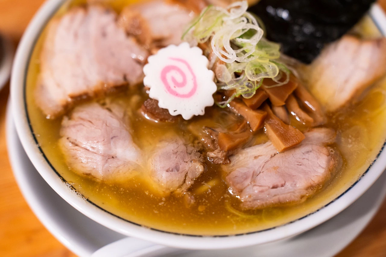멸치 육수 베이스의 라멘 한 종류만 판매하고 있습니다. 위에 올린 토핑에 따라 차슈, 완탕, 달걀 라멘으로 나뉘고요. 저는 돼지고기 차슈를 듬뿍 올린 차슈 라멘에 반숙 달걀을 추가했습니다. 가격은 1380엔. 과장 조금 보태 면보다 많은 고기 양을 생각하면 저렴한 편이에요. 담음새가 투박한 것도 가게 분위기와 잘 어울립니다.