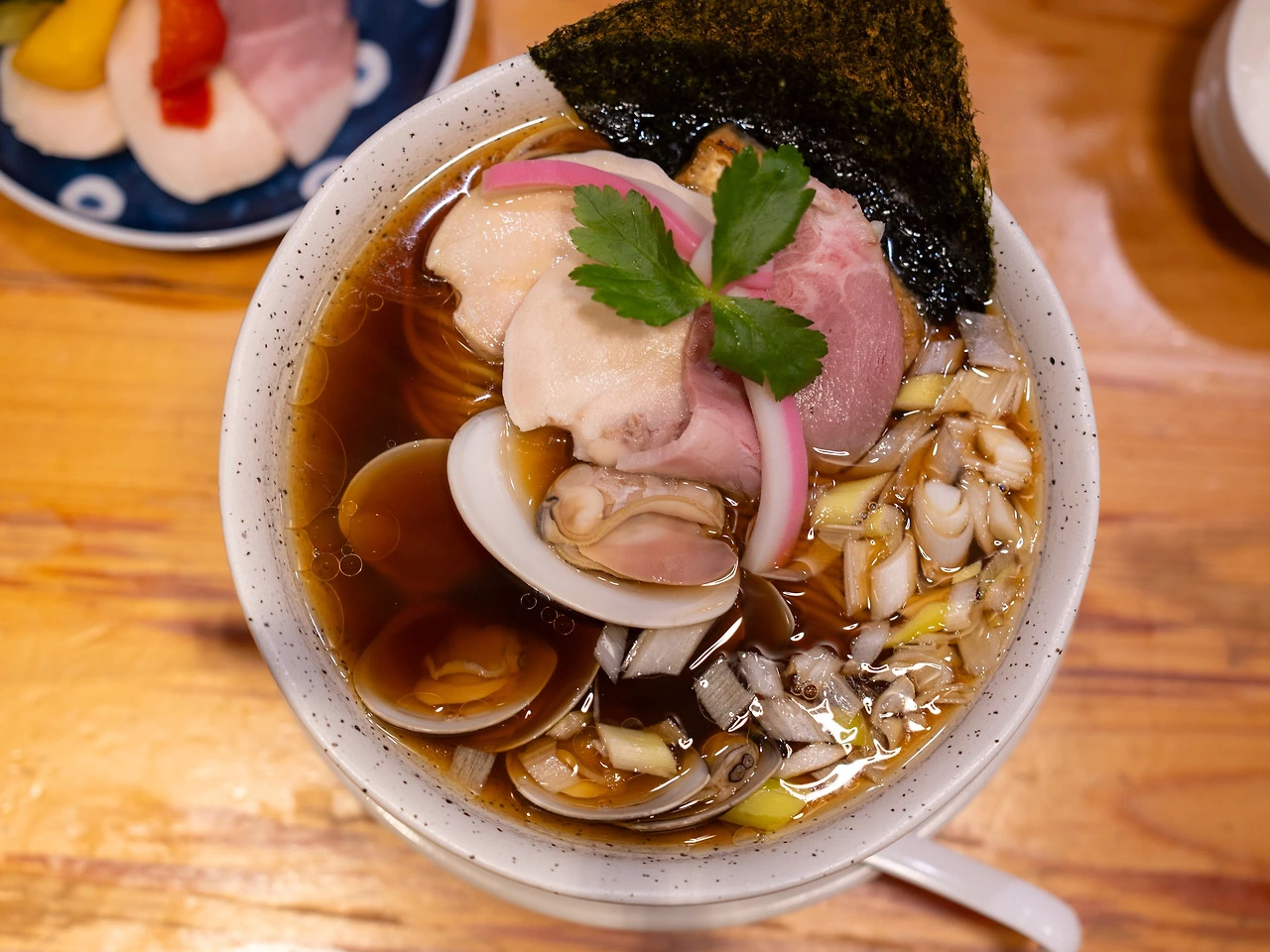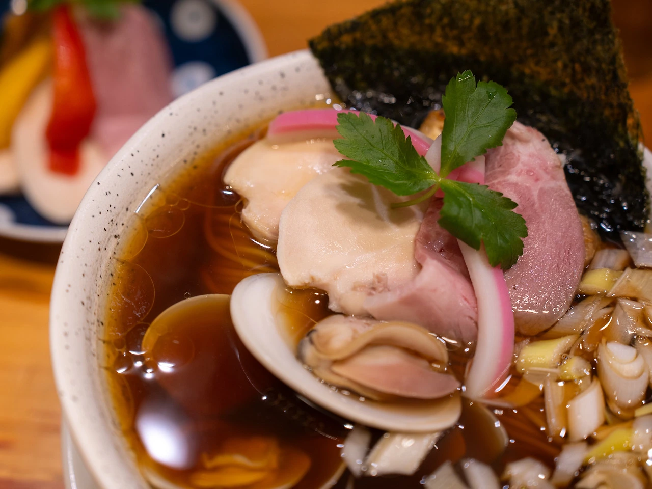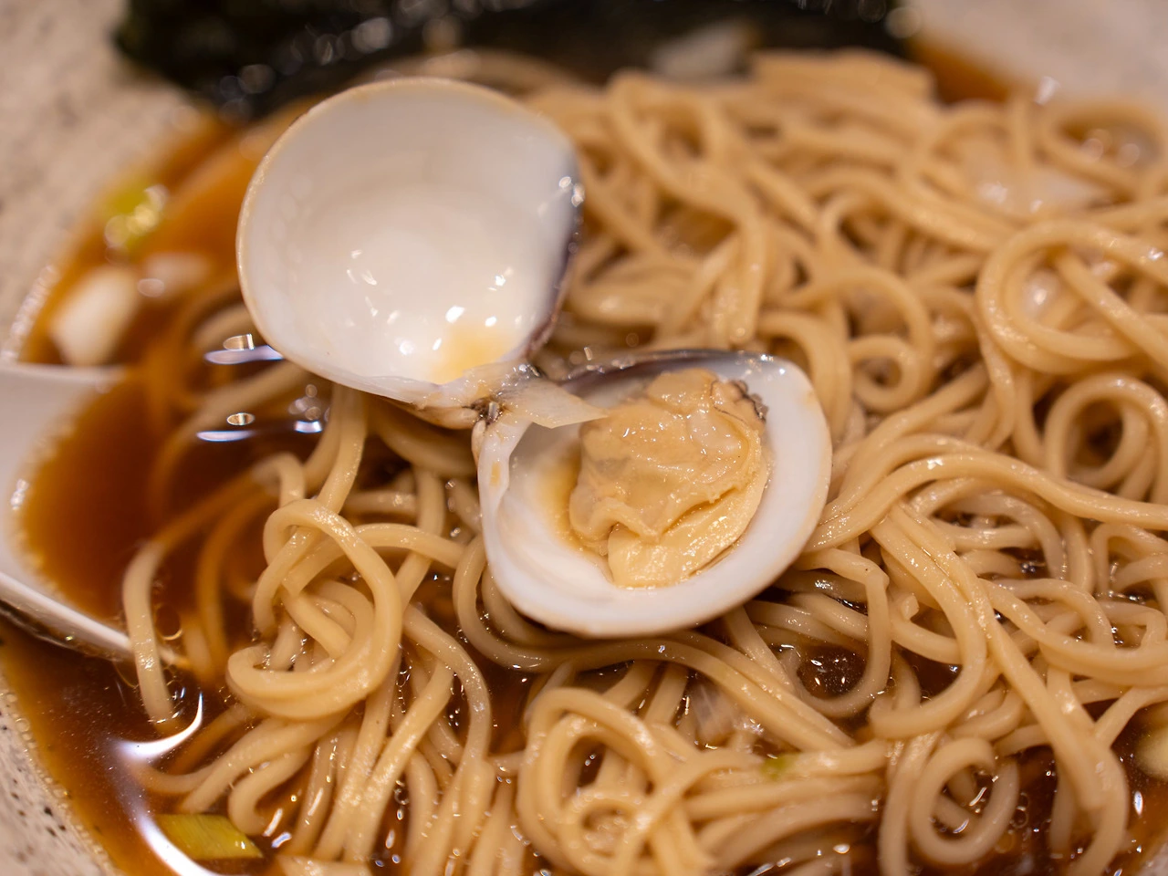 우려했던 조개 비린내가 없었던 게 천만다행입니다. 미역국에 조개 하나만 넣어도 입을 떼는 제가 국물을 떠서 마실 정도였으니 비린맛을 잘 잡은 거죠. 반면 조개 육수 특유의 시원함과 감칠맛은 강해서 고급스러운 국물 요리를 먹는 기분이었습니다. 술 좋아하시는 분들은 이 라멘이 정말 마음에 드실 거예요. 안주부터 해장까지 전천후로 즐길 수 있는 라멘이니까. 다만 간이 좀 센 편입니다. 일본 여행 다녀온 분들이 많이 말씀하시죠. 일본 음식이 생각보다 짜다고. 가격에 맞게 고명도 풍성합니다. 수비드 조리한 닭고기와 돼지고기, 어묵, 파, 김, 유부 그리고 두어 종의 조개. 주인공은 단연 조개겠지만 저는 역시나 육고기가 나았습니다. 면은 중면 정도. 맑은 국물이라 면에 국물의 맛과 간이 충분히 배지 않았다는 느낌이 들었는데 그래서 오히려 좋았습니다. 담백한 면 맛을 즐길 수 있었거든요. 면이 살짝 덜 익힌 듯 나온 것도 제 취향이었고요.