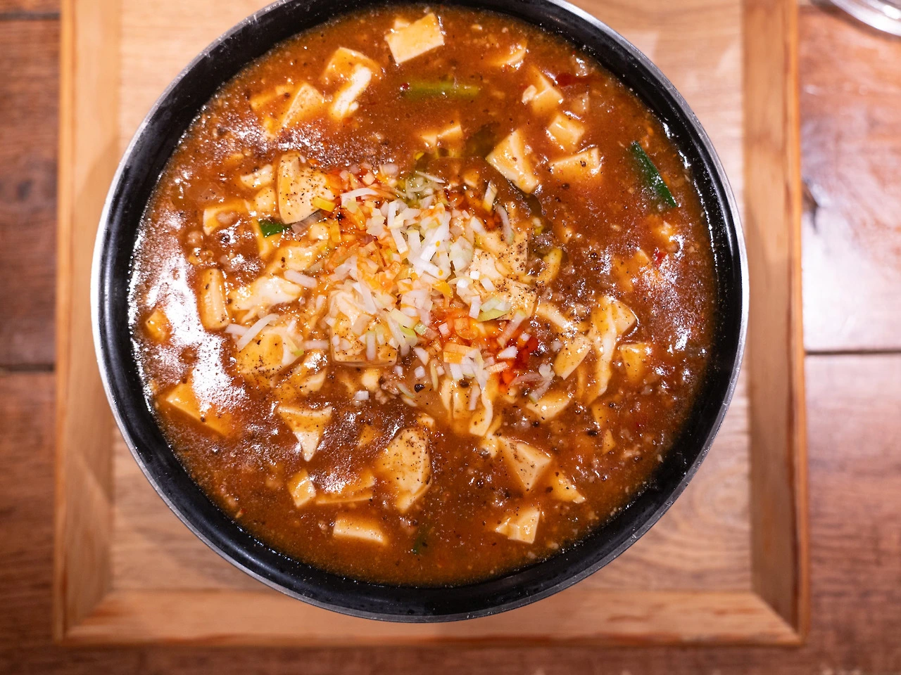 두 번째 방문했을 때는 치즈와 돈카츠를 추가한 마파두부면을 먹었습니다. 대기줄에 서 있을 때까지도 산라탕면을 먹을 생각이었으나 가게 안에 들어가 냄새를 맡고 생각이 바뀌었어요. 잘 튀긴 돈카츠를 마파두부 안에 넣고 치즈를 올렸는데 그 조화가 나쁘진 않았지만 굳이 돈카츠를 넣을 필요가 있을까, 하는 생각이 들더군요.