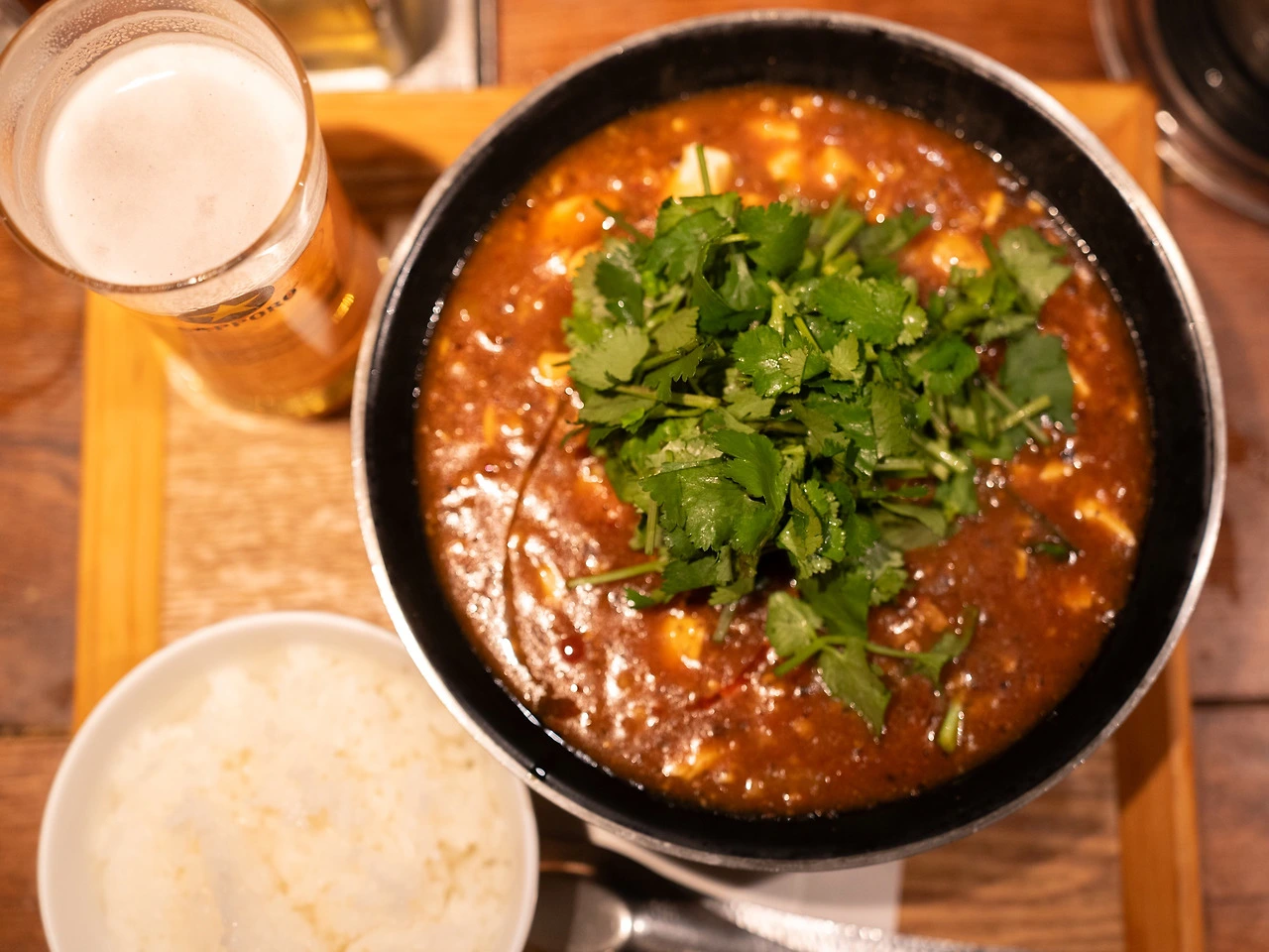 두 번 모두 마파두부면을 먹었습니다. 가격은 1150엔으로 저렴한 편입니다. 양도 꽤 많거든요. 첫 방문 때는 밥과 고수를 추가했습니다. 먼저 다녀간 사람들의 후기에 고수 추천이 꽤 있었거든요. 밥은 마파두부 덮밥까지 함께 즐기기 위함이었고요. 거기에 나마비루까지. 특히 이 집 생맥주 크림 올리는 솜씨가 좋았습니다.