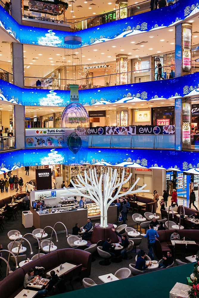밤이 긴 모스크바에서 오후 8시면 한창 저녁을 먹을 시간입니다. 많은 레스토랑에는 이제 막 하루 일과를 마치고 연인 혹은 맘 맞는 사람들과 저녁 식사를 즐기는 풍경을 손쉽게 볼 수 있죠. 때문에 대형 쇼핑몰이나 식당가가 가장 활발한 시간대도 이 때입니다. 긴 밤과 어둠에 대한 보상심리라도 있는 것처럼 모스크바의 대형 쇼핑몰들은 지나치게 밝은 실내 조명을 쏘아대며 다른 도시에서 볼 수 없는 밤풍경들을 만들고 있죠.