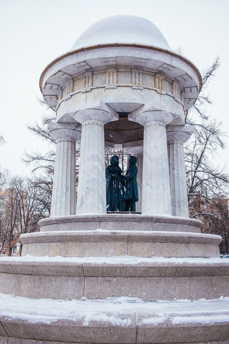 다음으로 찾은 곳은 이 날의 유일한 목적지(?)였던 푸쉬킨의 동상입니다. 러시아인의 존경을 받는 대문호 푸쉬킨이 이 곳에서 부인 나탈리야에게 청혼을 했다고 하네요. 그것을 기념하기 위해 이 곳에는 이렇게 두 사람의 동상이 세워져 있습니다. 모스크바에만 여러 곳, 러시아 전역으로 치면 수 많은 푸쉬킨의 박물관이 있는데 이렇게 도시 곳곳에 그를 기념하는 장소까지 있는 것을 보면 푸쉬킨이 정말 러시아인에게 가장 존경을 받는 사람이 맞구나라는 생각이 듭니다. 눈이 쌓여 그냥 지나치기 쉬운 조용한 풍경이지만, 나머지 계절에는 동상 앞에 작은 분수가 있어 시민들의 쉼터로도 사랑을 받는다고 합니다.