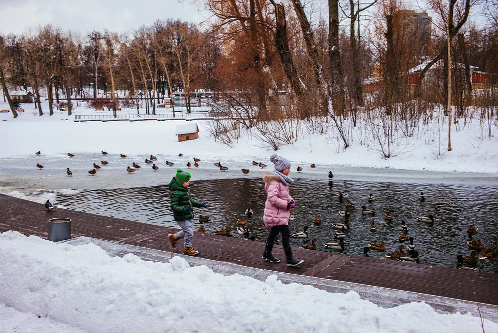 사진 찍는 것도 잊은 채 멍하니 이 공원을 돌기를 한 시간쯤 되었을까요, 공원 끝 부분에 있는 작은 연못에서 '사람의 온기'를 느끼고 달려갑니다. 한겨울 고리키 공원에서 그렇게 보기 힘들다는 사람, 게다가 아이들입니다! 한겨울 추위에도 가족 단위로 공원에 나온 이들은 물 위의 생명체를 보고 몹시 반가워했습니다 -마치 아이들을 반가워했던 저와 같군요- 추위에 양 볼이 빨갛게 얼었는데도 깔깔 웃으며 오리들을 쫓는 걸 보니, 역시 러시아 아이들은 떡잎부터 다르다 싶습니다. 하지만 그럼에도 한국과 비슷한 풍경을 발견했던 것은, 억지로 끌려나온 듯한 아버지의 무료한 표정이었습니다.