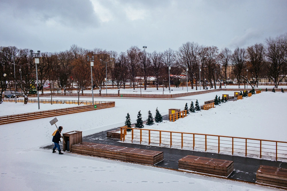 모스크바의 겨울 날씨라면 별다른 노력 없이 그저 '물만 뿌려놓는 것 만으로' 간단하게 스케이트장이 완성될 것 같지만, 그렇다 해도 이 엄청난 길이의 트랙은 한국에선 만나기 불가능한지라 한 번 경험해보고 싶었습니다만, 이 날은 그냥 '모두 다 쉬는 날'이더군요. 마침 아침까지 내린 눈이 쌓여 얼음도 제대로 볼 수 없었습니다. 트랙을 힘겹게 돌며 휴지통과 시설물들을 정리하는 직원의 모습에서 불과 어제까지 이 스케이트장이 얼마나 뜨거웠을지 조금은 느낄 수 있습니다.