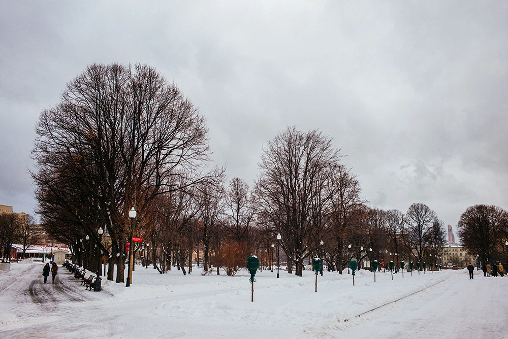 확실히 그랬습니다, 제 기분에는 요. 제 기대대로 이 넓은 공원이 낭비가 아닐까 싶을 정도로 사람은 거의 보이지 않았고, 우중충한 날씨와 쌓인 눈, 그리고 긴 겨울 축제를 끝내고 휴식에 들어간 스케이트 장과 각종 편의시설 등 때문에 마치 들어오지 말아야 할 곳에 들어온 느낌을 산책 내내 받았는데요, 입구에 설치된 저 구조물이 특히 그랬습니다. 분명 어제까지만 해도 저 조명들이 모두 불을 밝히며 사람들을 환영하는 꽃길을 만들어 주었겠지만, 이 날 이 길을 걷는 걸음은 어쩐지 민망했었죠.