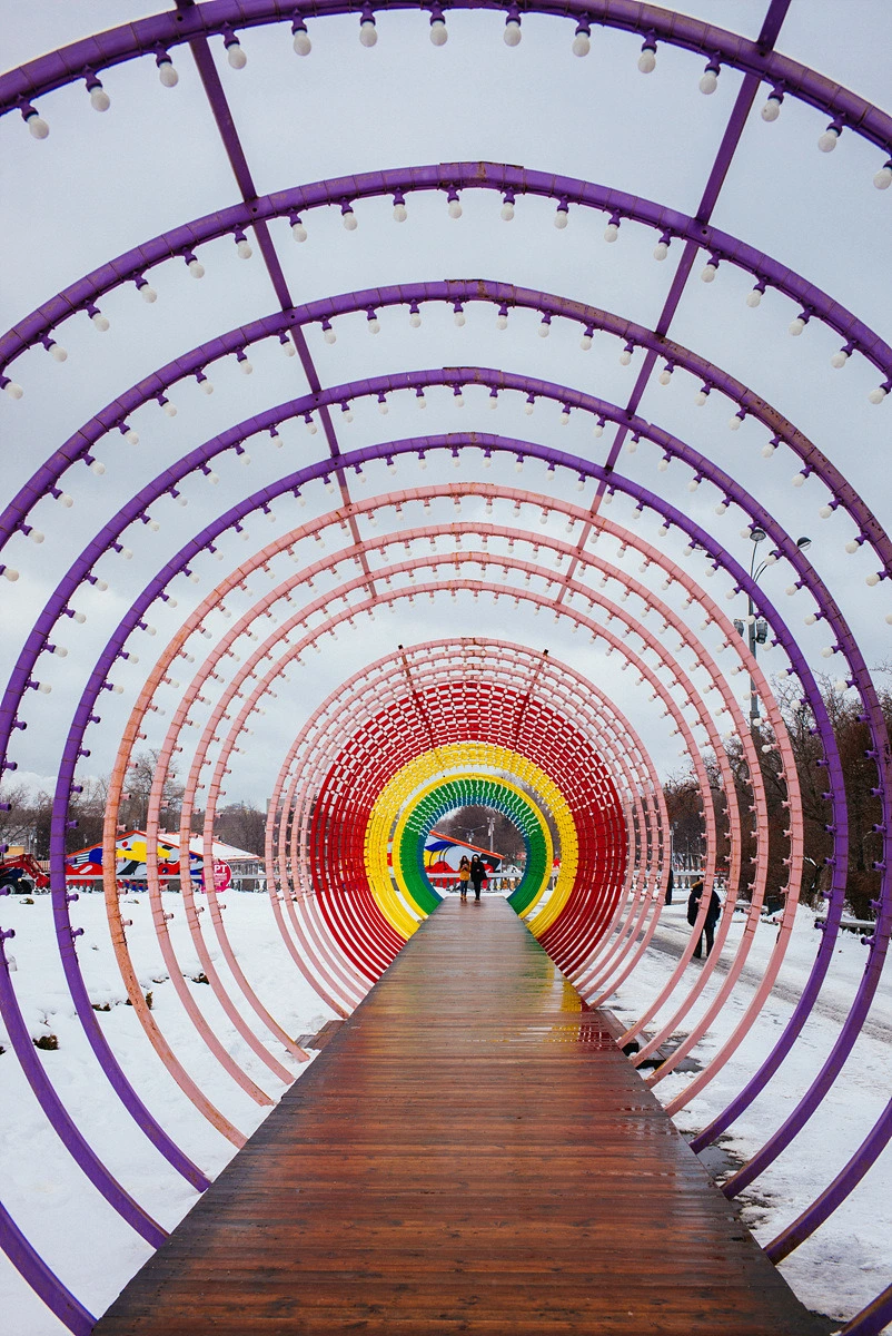 그래서 고리키 공원에서의 시간은 이 곳에서 열렸던 -그랬을 거라고 추측하는- 겨울 축제의 흔적들을 뒤늦게 밟으며 상상하는 것으로 채웠습니다. 사진에 보이는 매력적인 구조물은 겨울이면 모스크바 어디에서나 볼 수 있다는 스케이트장의 모습입니다. 고리키 공원은 그중에서도 가장 큰 규모의 스케이트장을 자랑하는데요, 이 공원 내에 흐르는 개울을 모두 스케이트장으로 조성해, 우리가 흔히 놀이공원에서 즐기는 제자리 돌기의 스케이트 광장이 아닌, 어엿한 트랙 시스템을 갖췄습니다. 성인들의 내기 스케이트 경주를 해도 무리 없을 만큼의 엄청난 코스 규모 역시 이 공원의 '클라스'를 보여주죠?