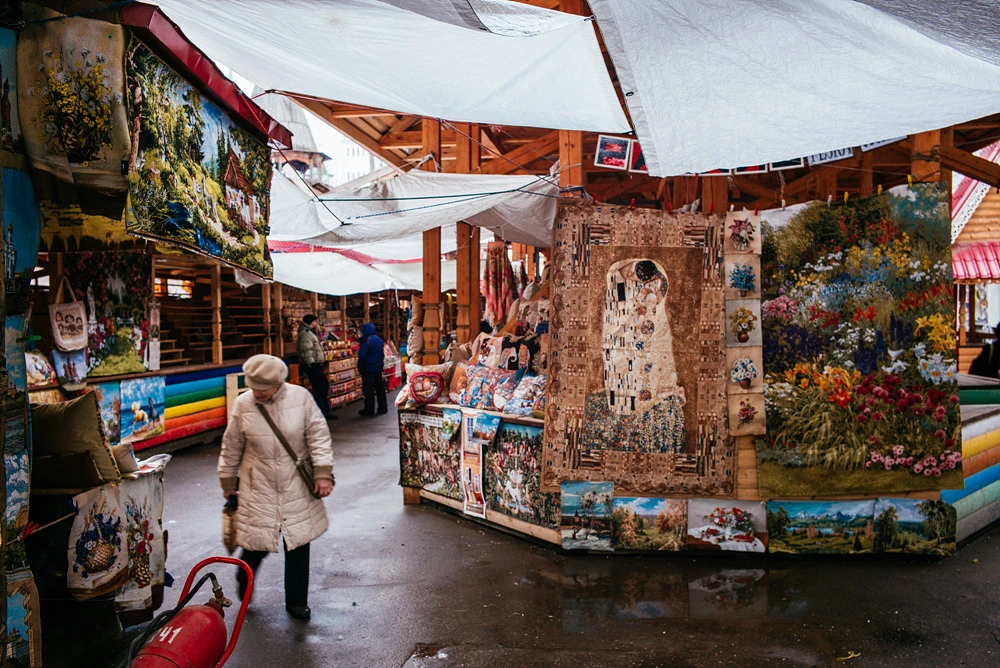 이른 시각이지만 제법 많은 상점이 부지런히 영업 준비를 하고 있었습니다. 역시나 가장 먼저 보이는 것은 다양한 크기와 모양의 러시아 전통 목각인형 마뜨료시카였고, 사진에서처럼 이색적인 물품도 보였습니다. 클림트의 그림이 새겨진 커다란 카펫과 풍경, 정물화로 장식한 담요 등이 눈길을 끌었습니다. 이런 회화가 새겨진 상품들 역시 이즈마일롭스키 시장에서 많이 볼 수 있는 기념품 중 하나였습니다. 담요나 쿠션, 에코백까지 종류도 다양했죠. 저야 이 것들에서 러시아 고유의 냄새를 맡을 수 없어 별 관심 없이 지나갔지만요. -아마 메이드 인 차이나가 아닐까요?-