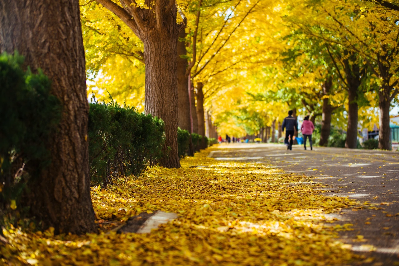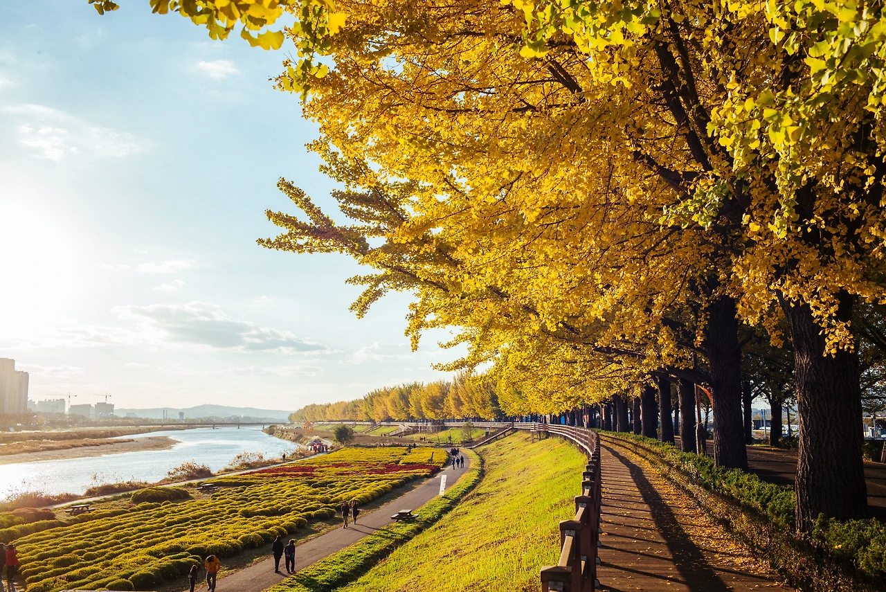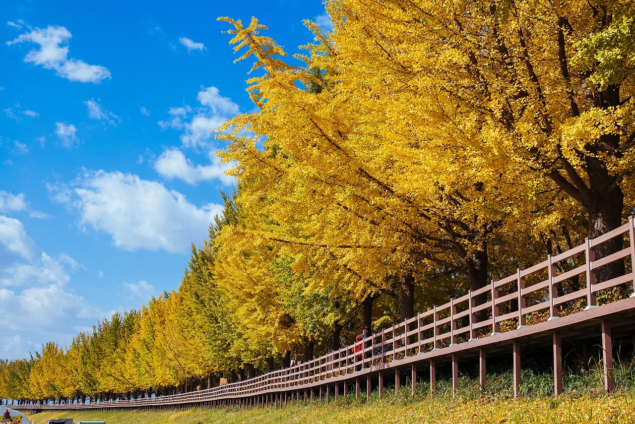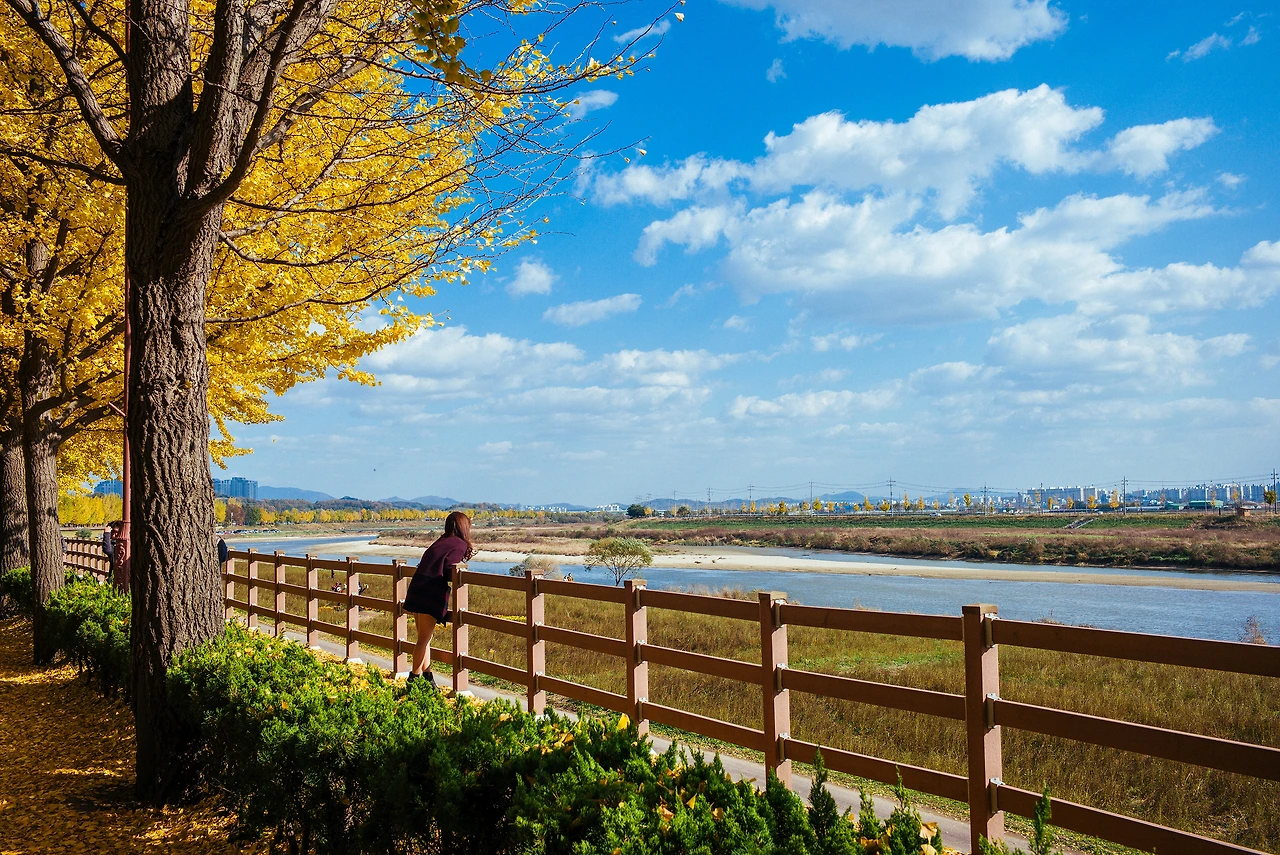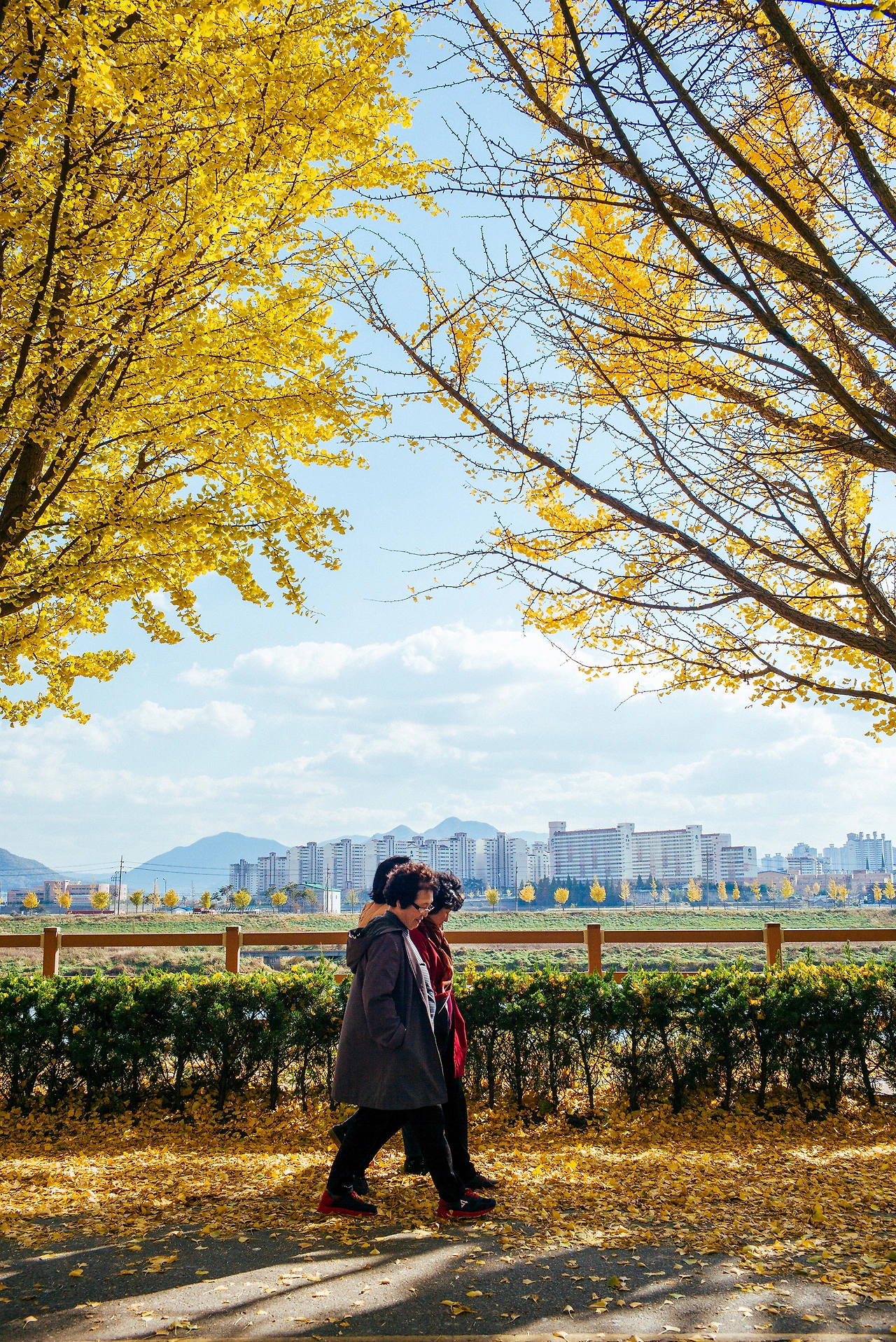 충남 아산에 위치한 곡교천을 따라 곧게 뻗은 이 길은 가을이면 노란색으로 빛납니다. 황금빛이란 고리타분한 표현을 쓰기 싫어도 멀리서부터 노랗게 빛나는 색이며 가을바람 한 움큼에 샤르륵 하고 흩뿌려지는 모양새가 꼭 그렇습니다. 덕분에 가을이면 전국에서 낭만을 찾아오는 사람들로 붐비는 곳이 되었죠.