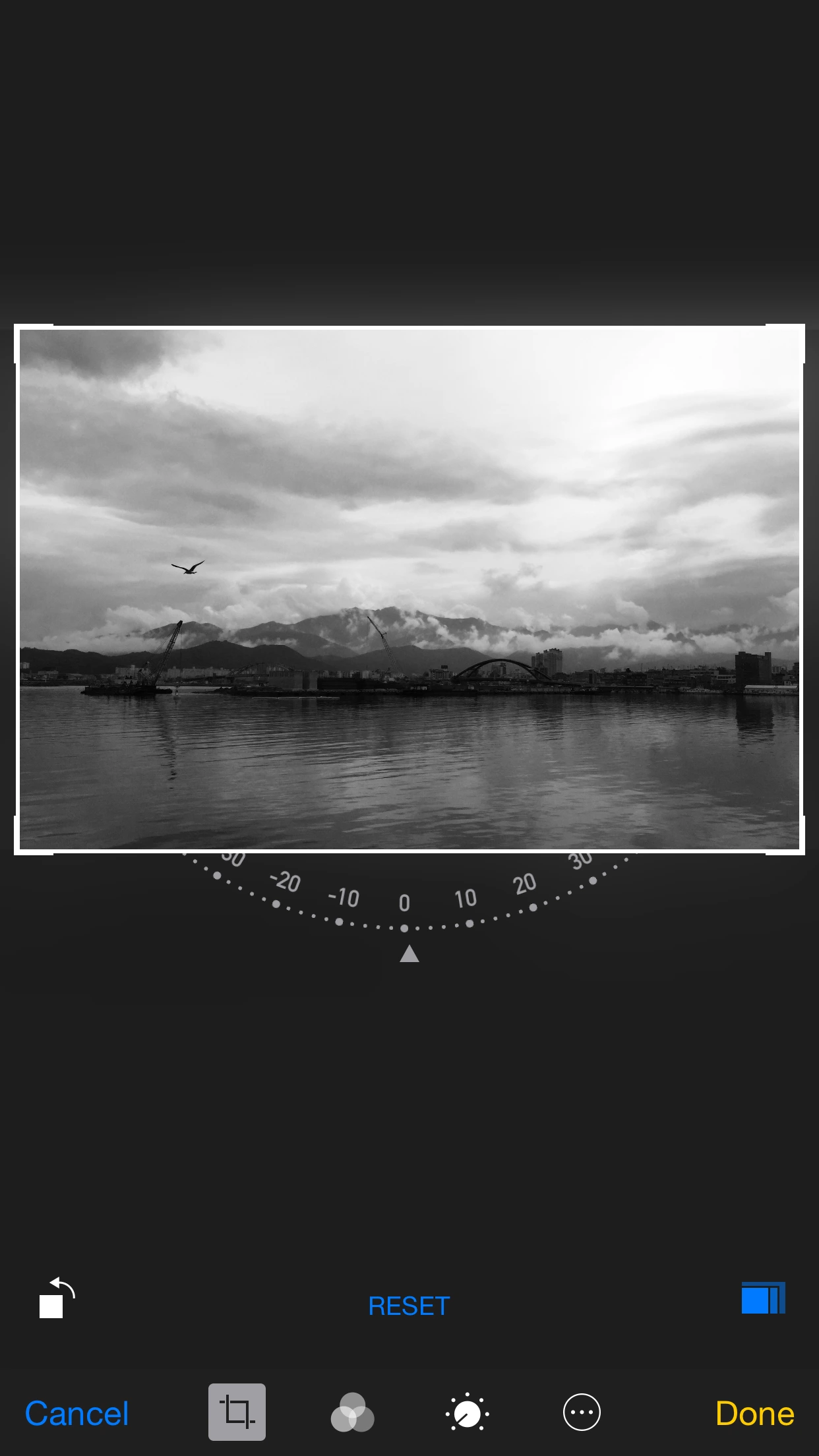 눈으로 볼 때는 멋져서 찍었는데, 정작 사진을 보니 어딘가 밋밋하고 심심하다 싶을 때는 이렇게 직접 보정을 하시면 더 좋습니다. 안 그래도 흐린 날씨 때문에 옅은 색감의 이 장면은 아예 강한 콘트라스트의 흑백 사진으로 보정하고, 위 아래를 조금 잘라내어 바다 너머 능선과 구름의 풍경을 조금 더 부각시켜보았습니다.