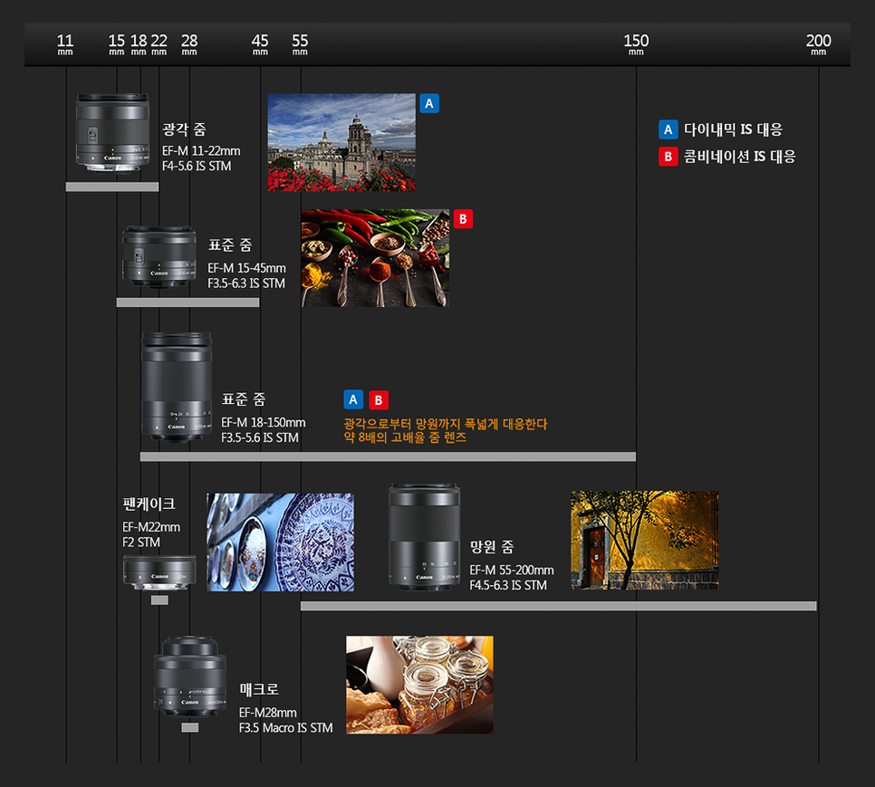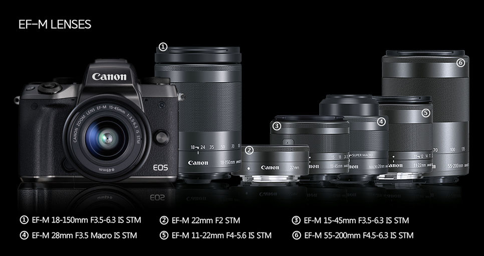 여기에 캐논 미러리스 카메라 전용의 EF-M 마운트에 사용할 수 있는 7종의 EF-M 렌즈군과