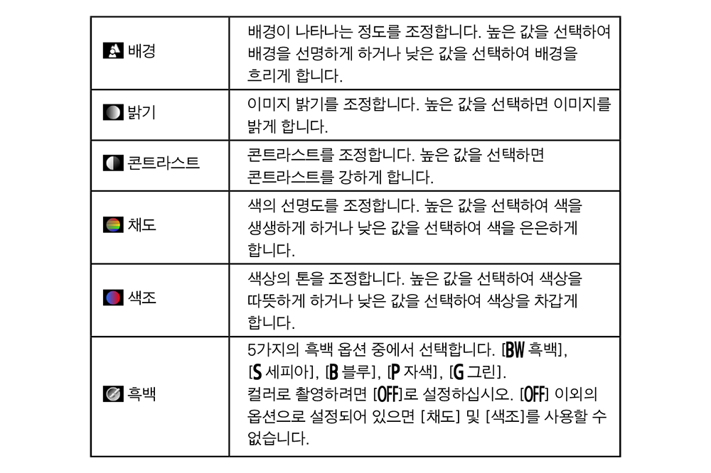 아웃포커싱을 통한 배경 흐림, 이미지 밝기 조절, 콘트라스트나 색의 선명도를 결정하는 채도, 색상의