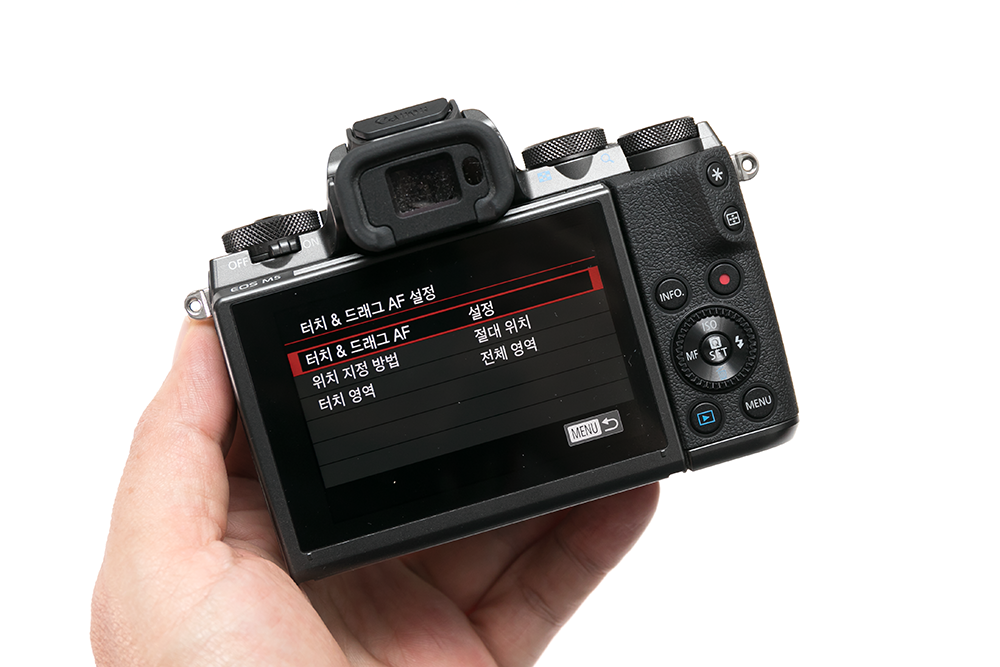 이를 터치 앤 드래그 AF라는 기능으로 제공하는데 접안 센서에 의해 LCD 모니터에서 EVF 디스플레이로 전환이 되는 시점에 터치 LCD는 화면이 꺼짐과 동시에 다른 기능을 제공하게 된다. 3.2형 터치 LCD는 AF 포인트 조정을 위한 하나의 조작 스위치로 변신하는 것이다.
