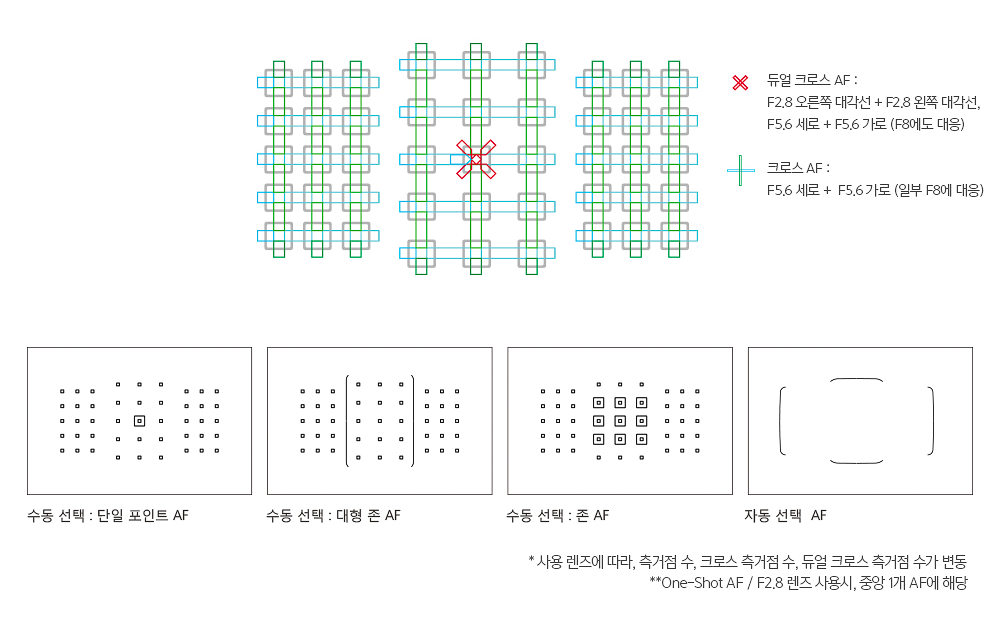 최대 개방 F8의 렌즈를 사용할 경우에는 중앙의 듀얼 크로스 AF까지 27개의 AF 포인트가 대응하는데 아빠 사진사와 같은 입문자에게 보급기 이상의 퍼포먼스에 만족할 수 있도록 한다. AF 포인트는 단일 포인트, 대형 존, 존, 자동 선택의 4가지 형태로 제공되고 각각의 형식간에 변경도 손쉽다.