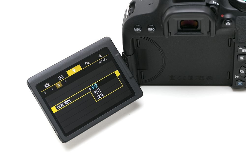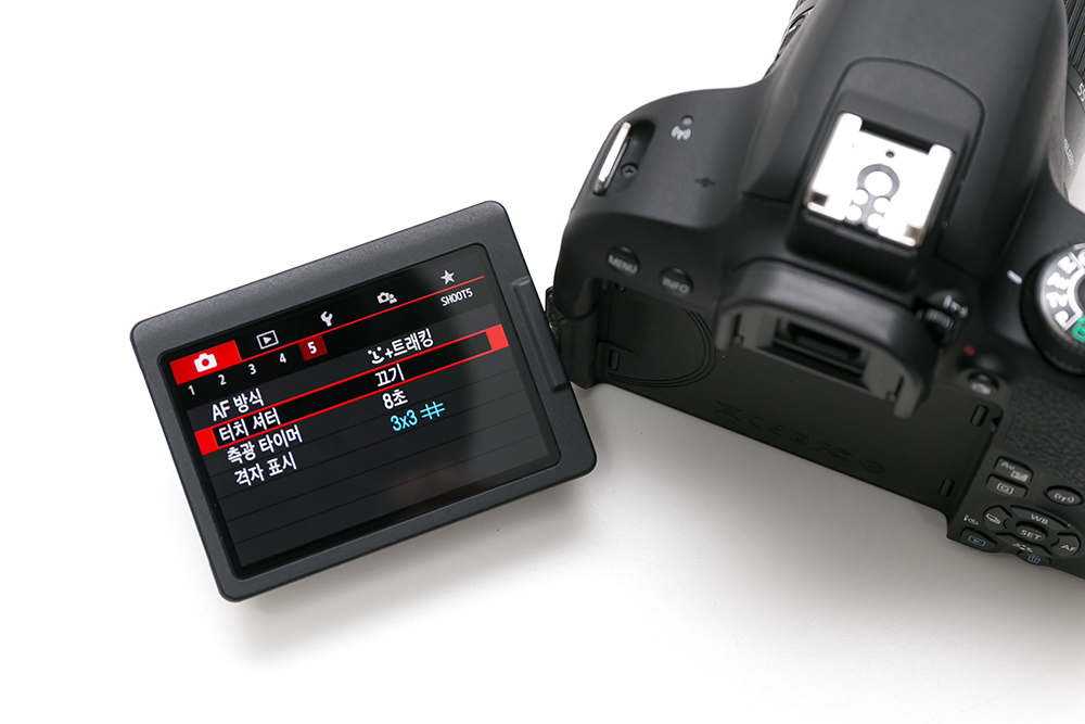 참고로 라이브 뷰 모드에서 사용이 가능한 터치 셔텨의 경우는 라이브 뷰 모드에서만 설정이 가능하다. 이때 설정에 따라 AF 혹은 AF 동작과 함께 촬영이 가능하도록 이루어진다. 라이브 뷰 모드가 아닌 일반 파인더 촬영 모드에서는 해당 메뉴가 활성화되지 않는다.